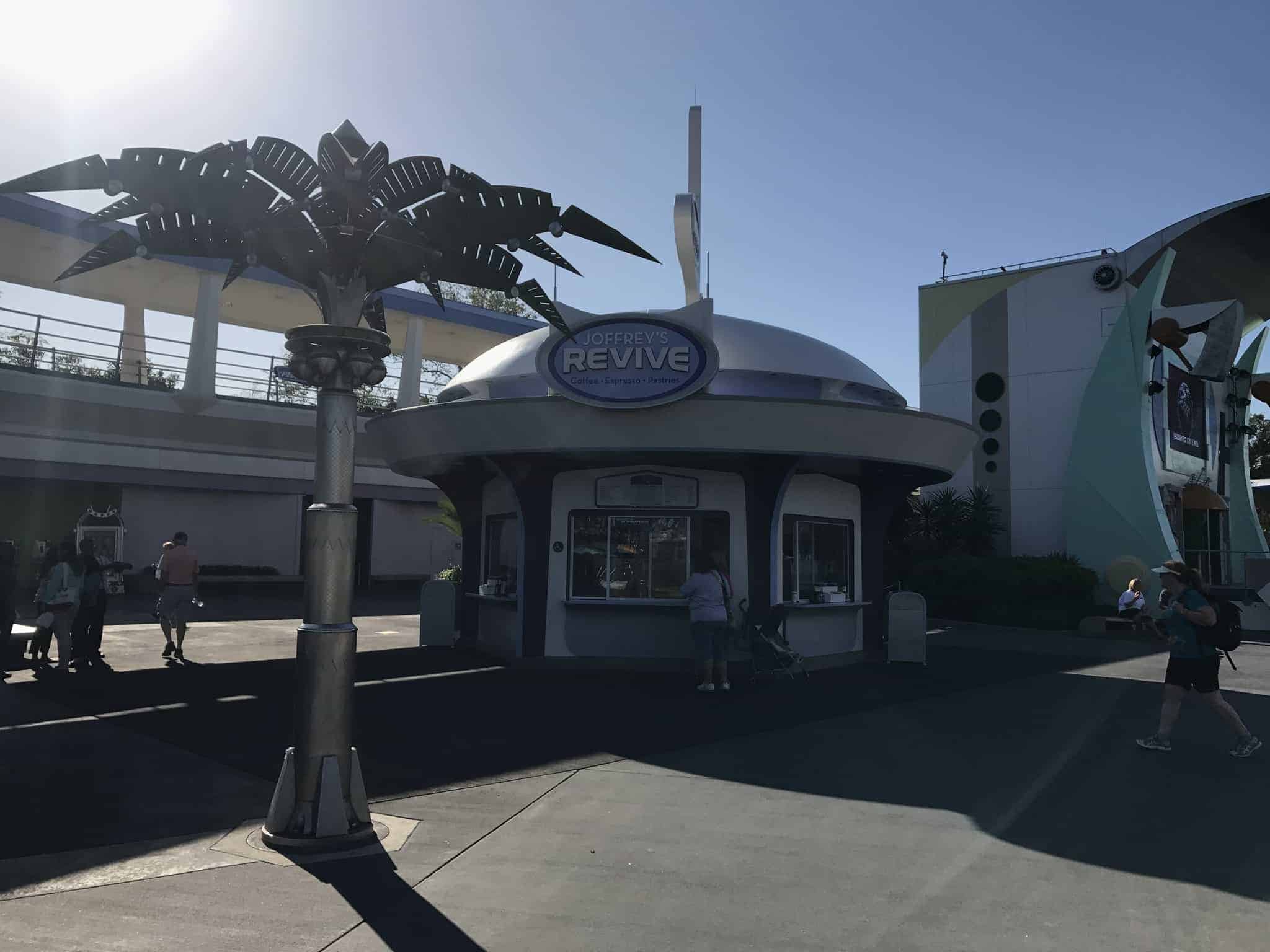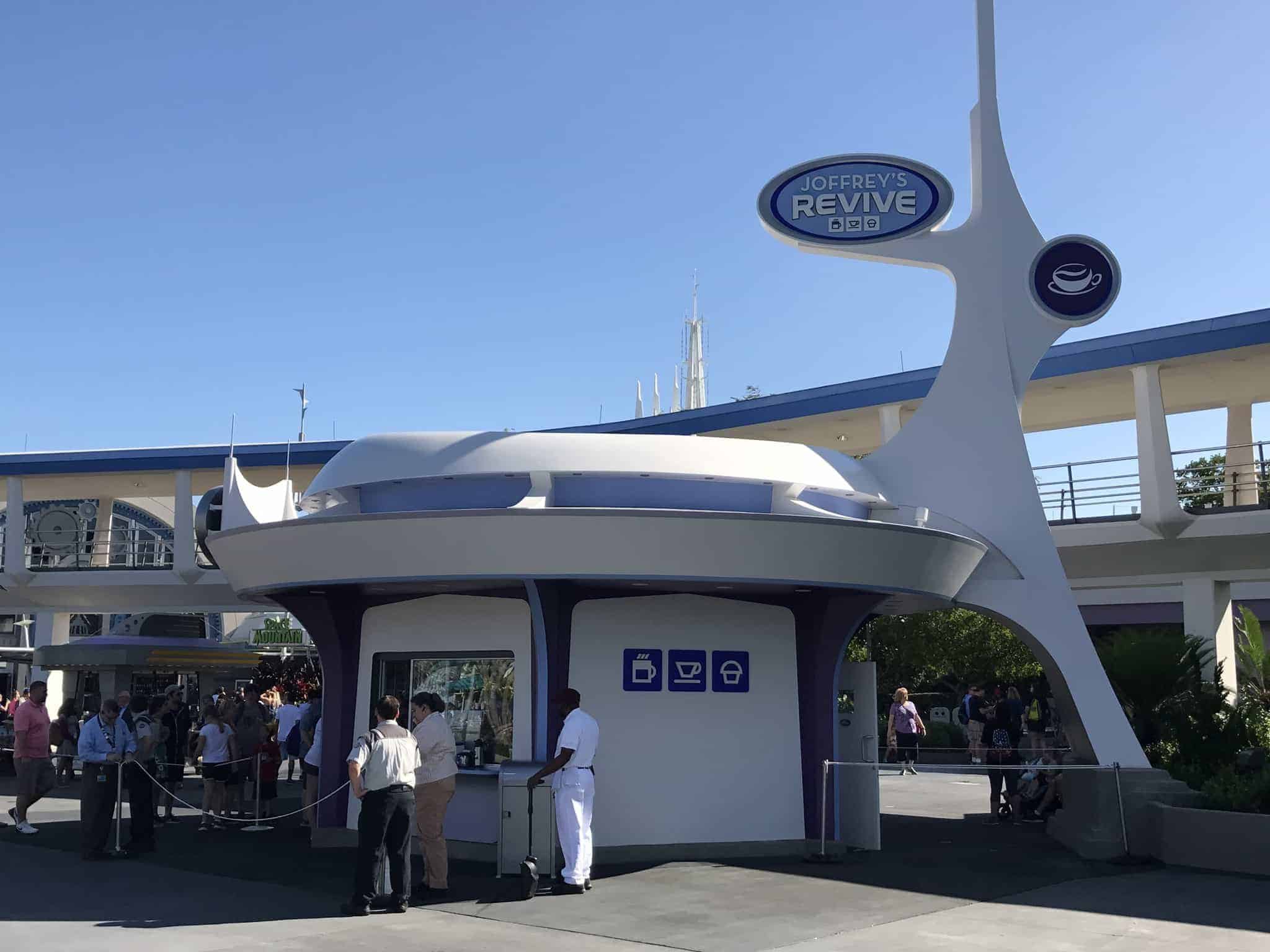 For months, we have been watching the construction of the Joffrey’s Coffee “Revive” kiosk in Tomorrowland at the Magic Kingdom. This morning, the coffee and pastry shop opened with the park.
