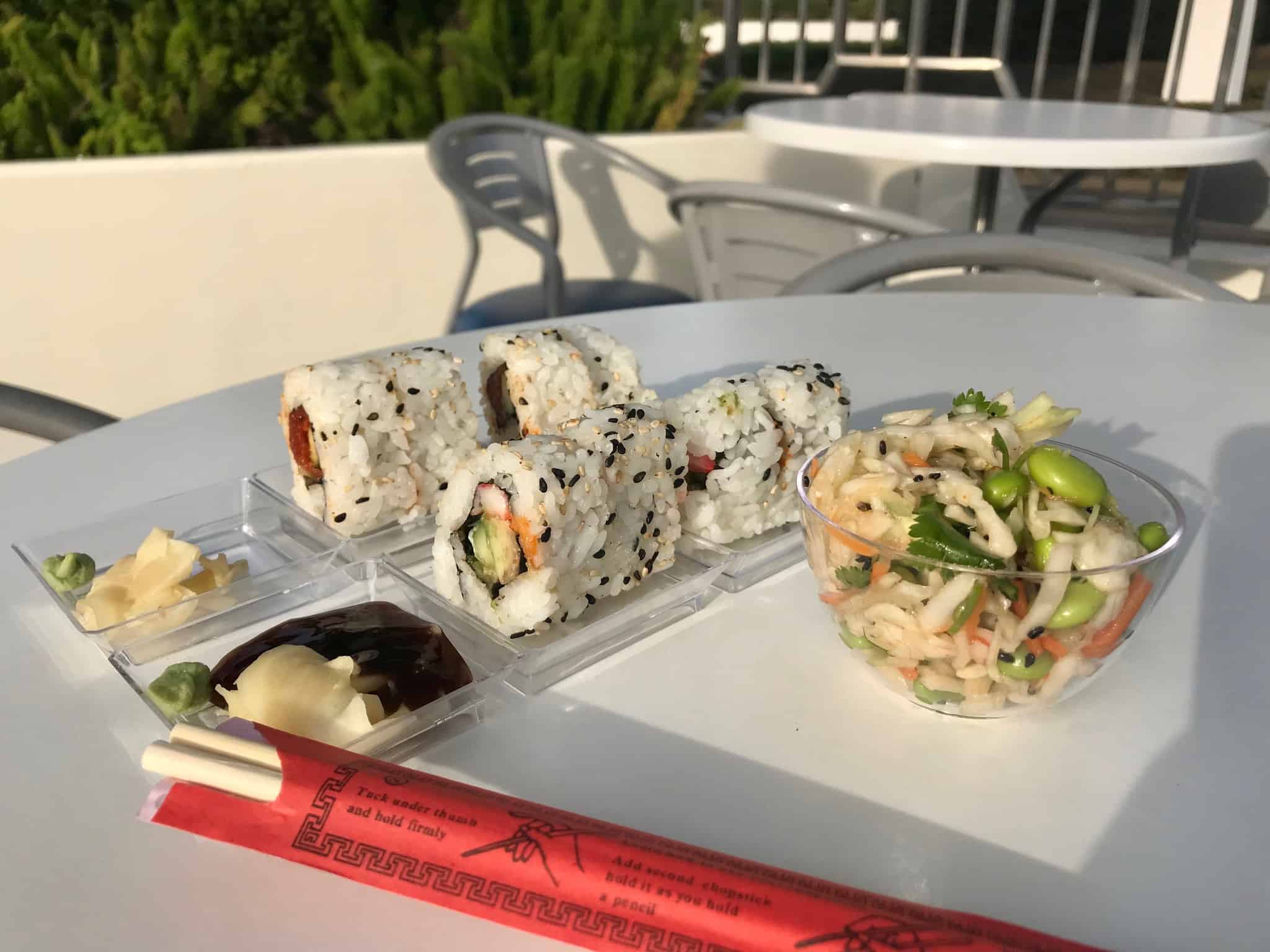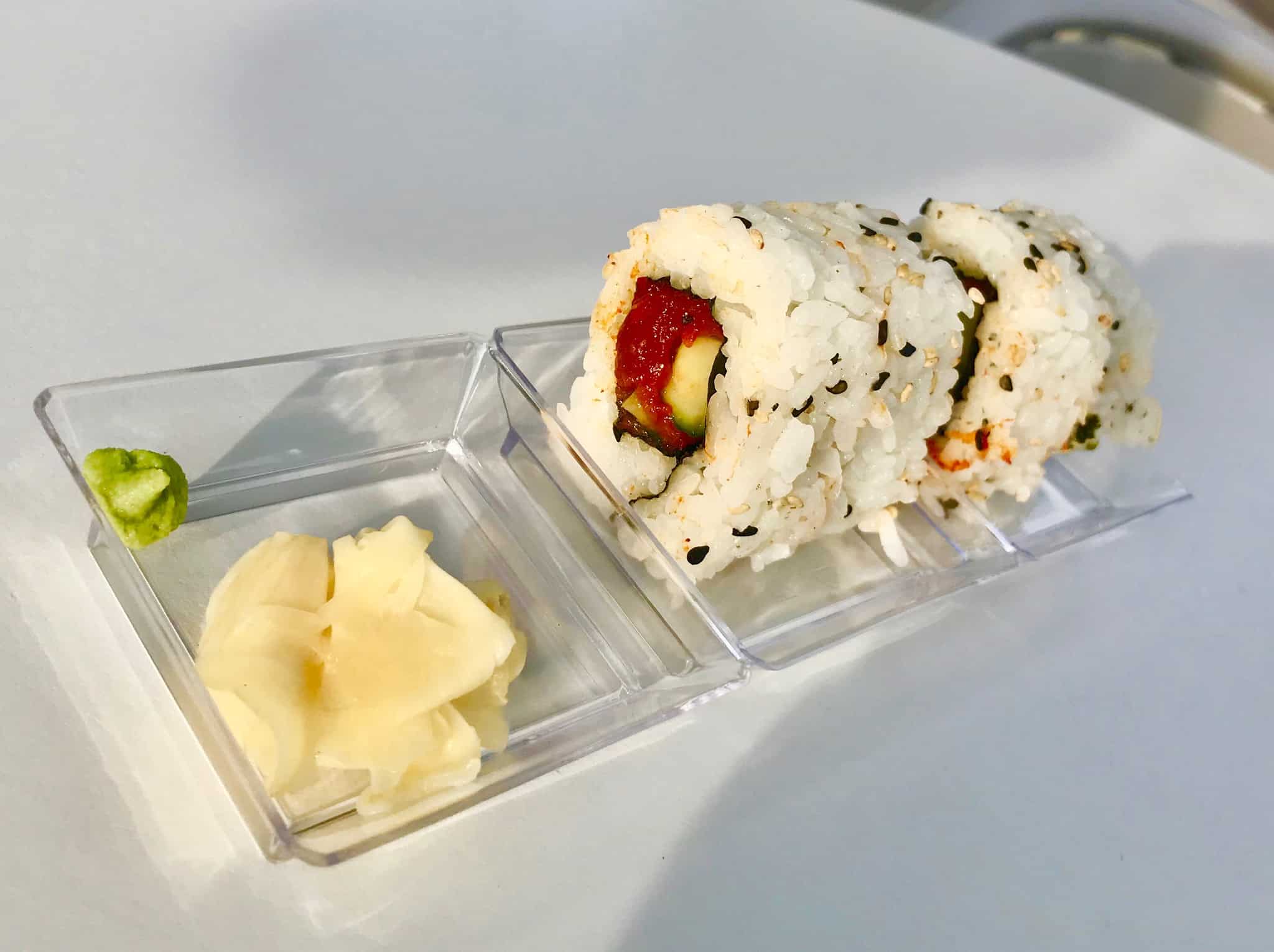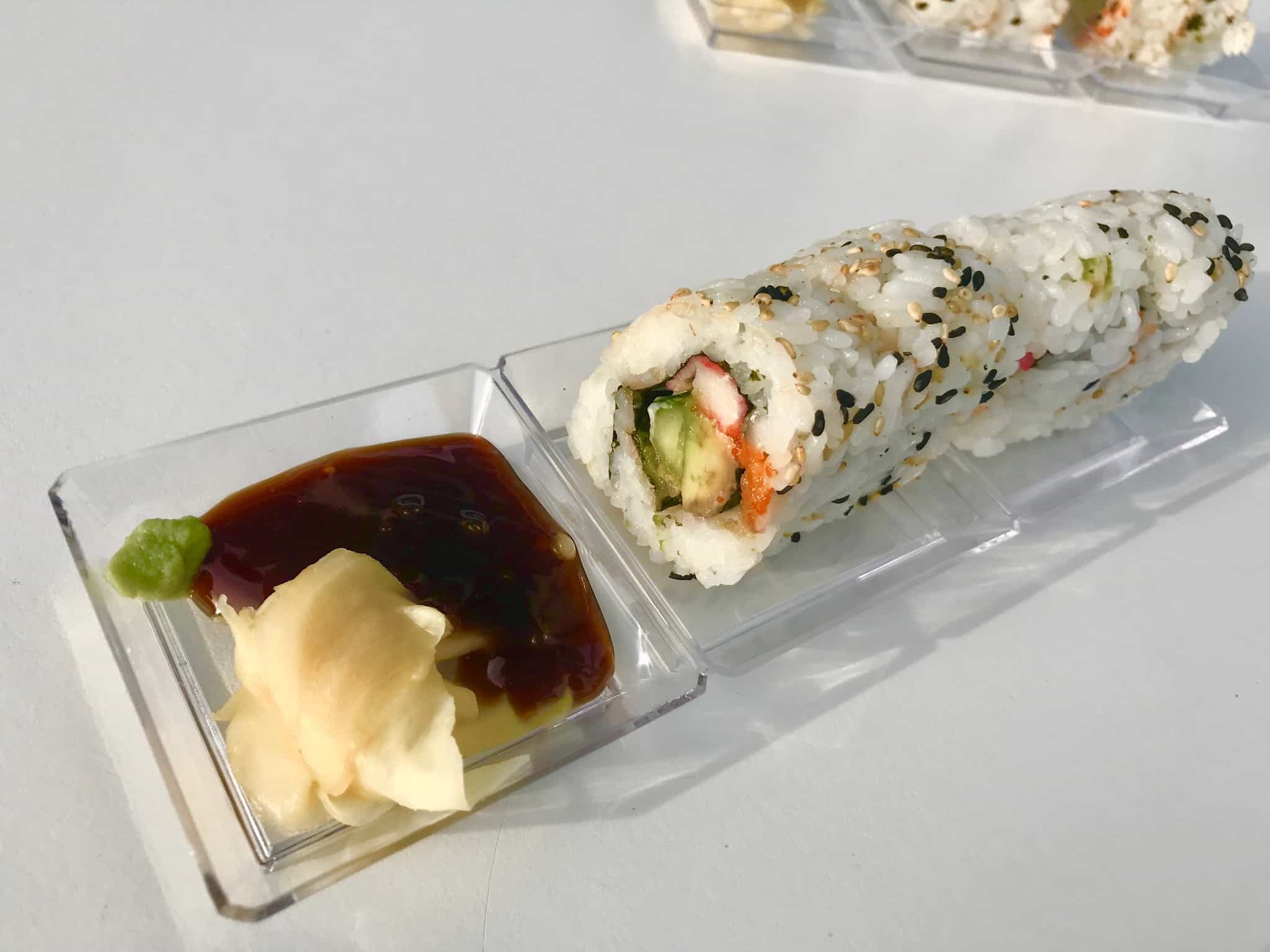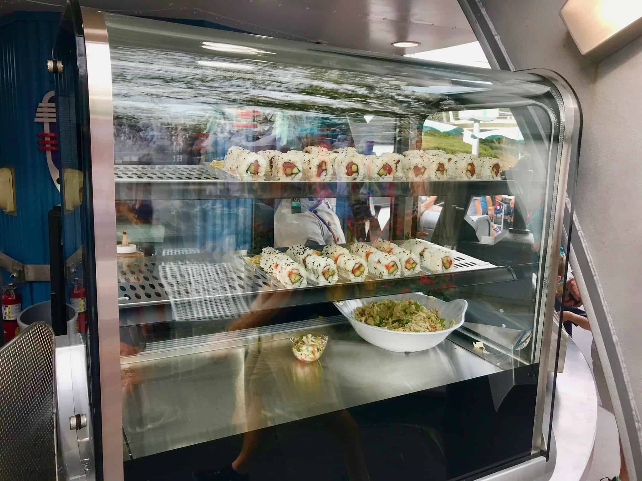 The Cool Ship in Tomorrowland recently started selling sushi. Let me say that again in case you think that was a typo… The Cool Ship (a large red rocket ship stand) in Tomorrowland at the Magic Kingdom (the park that has had challenges serving guests mildly exotic food at Skipper Canteen) is selling sushi (the Japanese preparation and serving of specially prepared vinegared rice combined with varied ingredients such as chiefly seafood, vegetables, and occasionally tropical fruits).