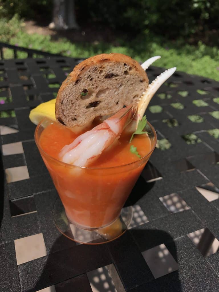 Chilled Cioppino soup with shrimp, crab claw and grilled olive bread — $7.75