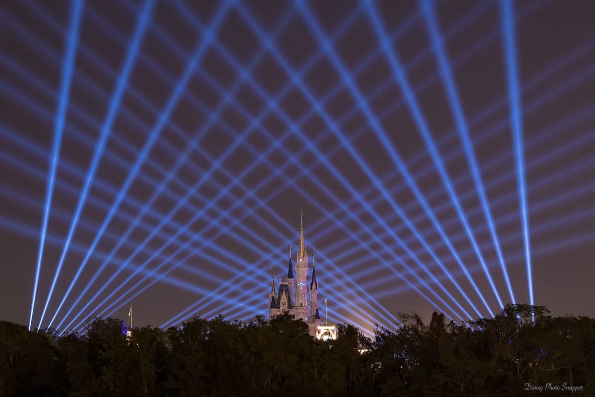 Seems like the same searchlight patterns and effects created for “Disneyland Forever” for Disneyland’s Diamond Celebration and which are now used in “Remember… Dreams Come True.” Although there seems to be about twice as many searchlights installed for “Happily Ever After.”