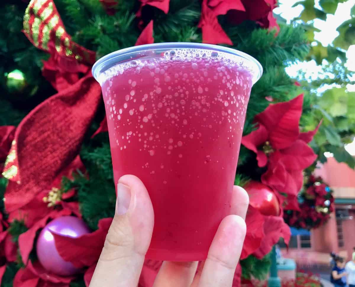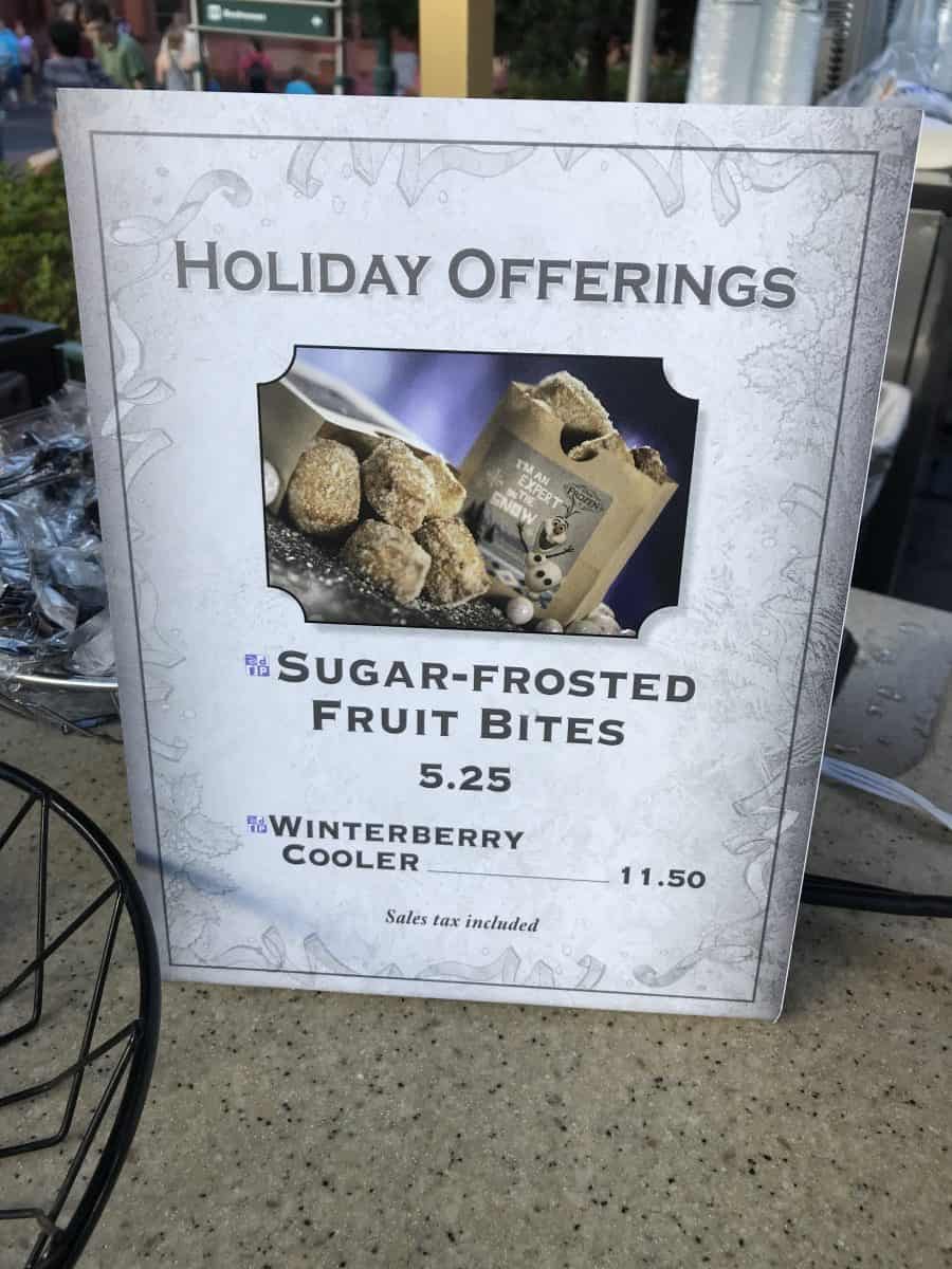 The pretzel cart near The Great Movie Ride… I mean, the soon to be Mickey and Minnie’s Runaway Railway is currently serving two holiday offerings for the Flurry of Fun: a Winterberry Cooler and Sugar-Frosted Fruit Bites.