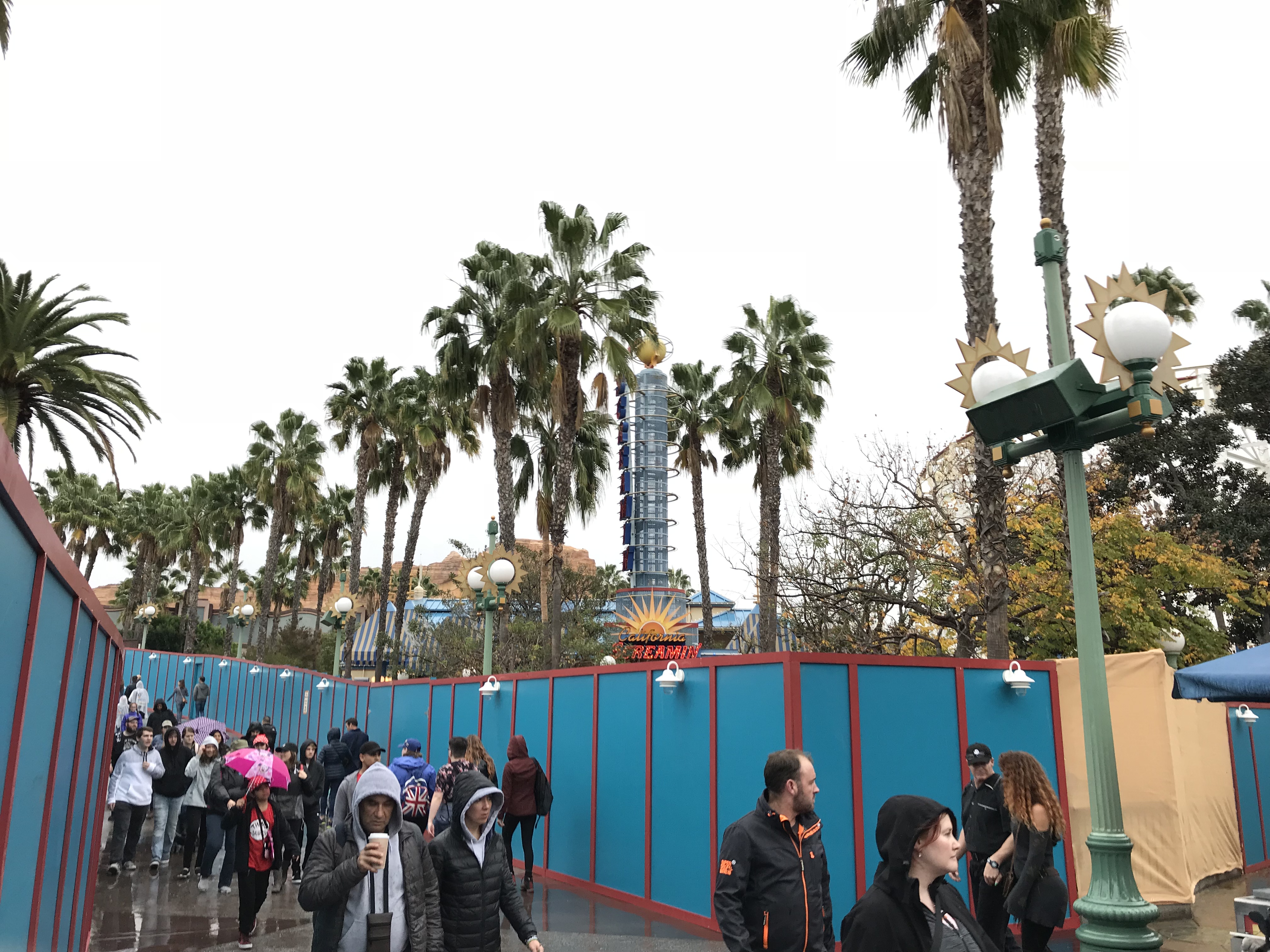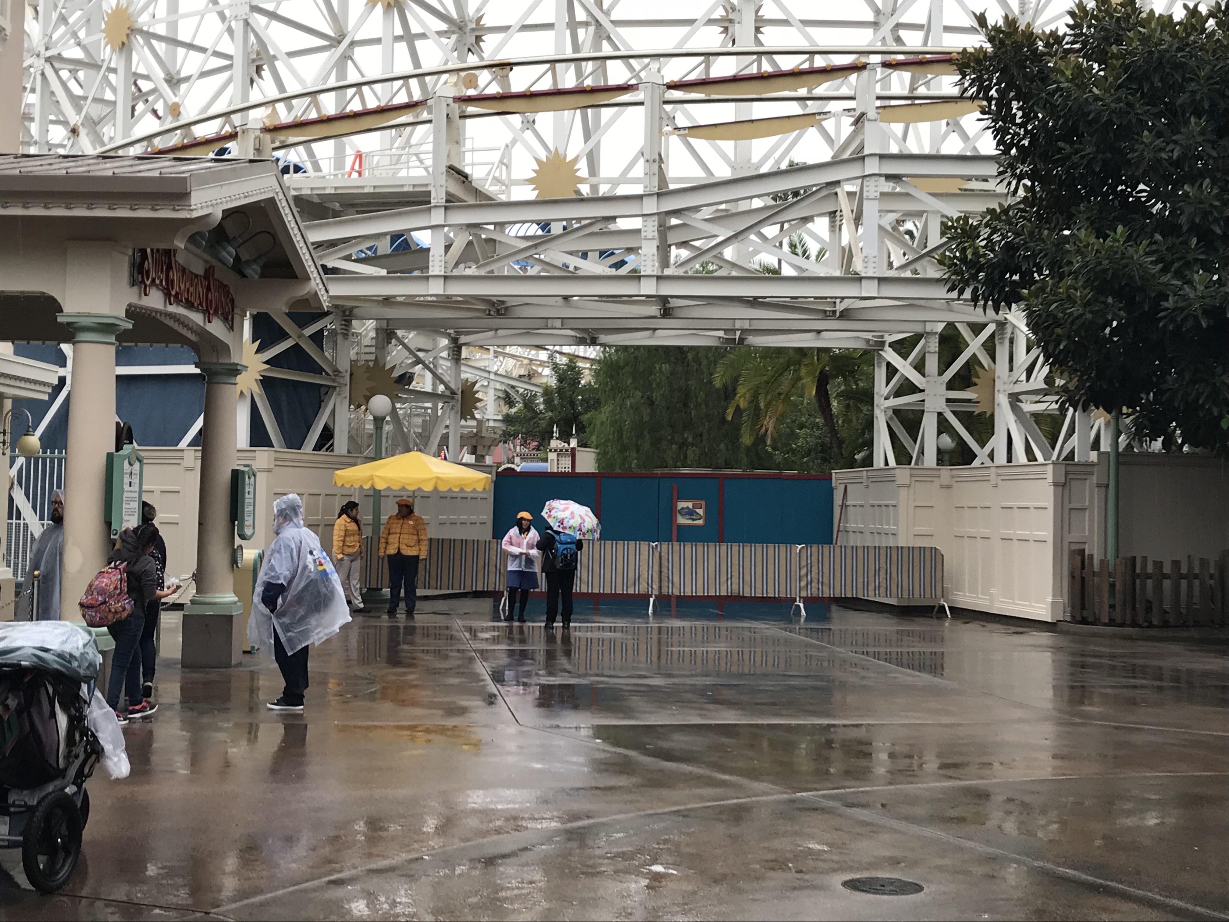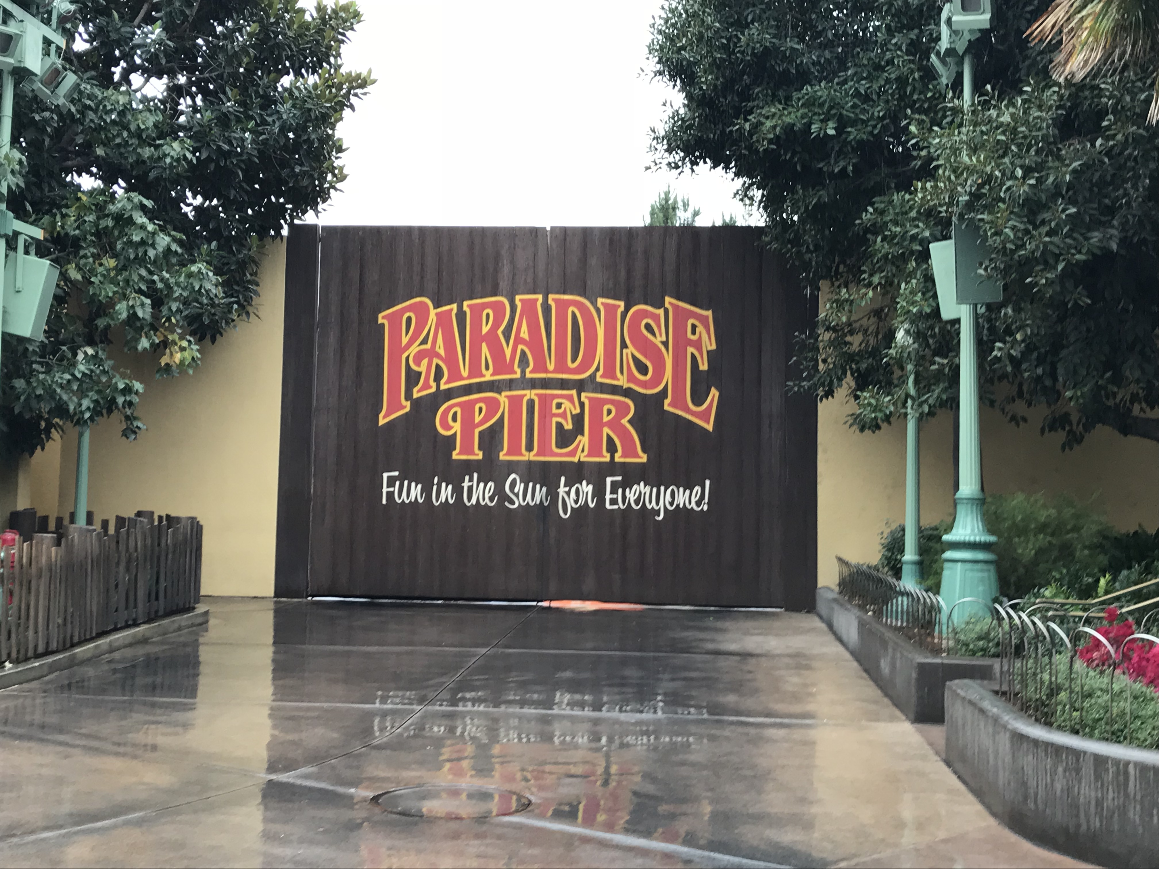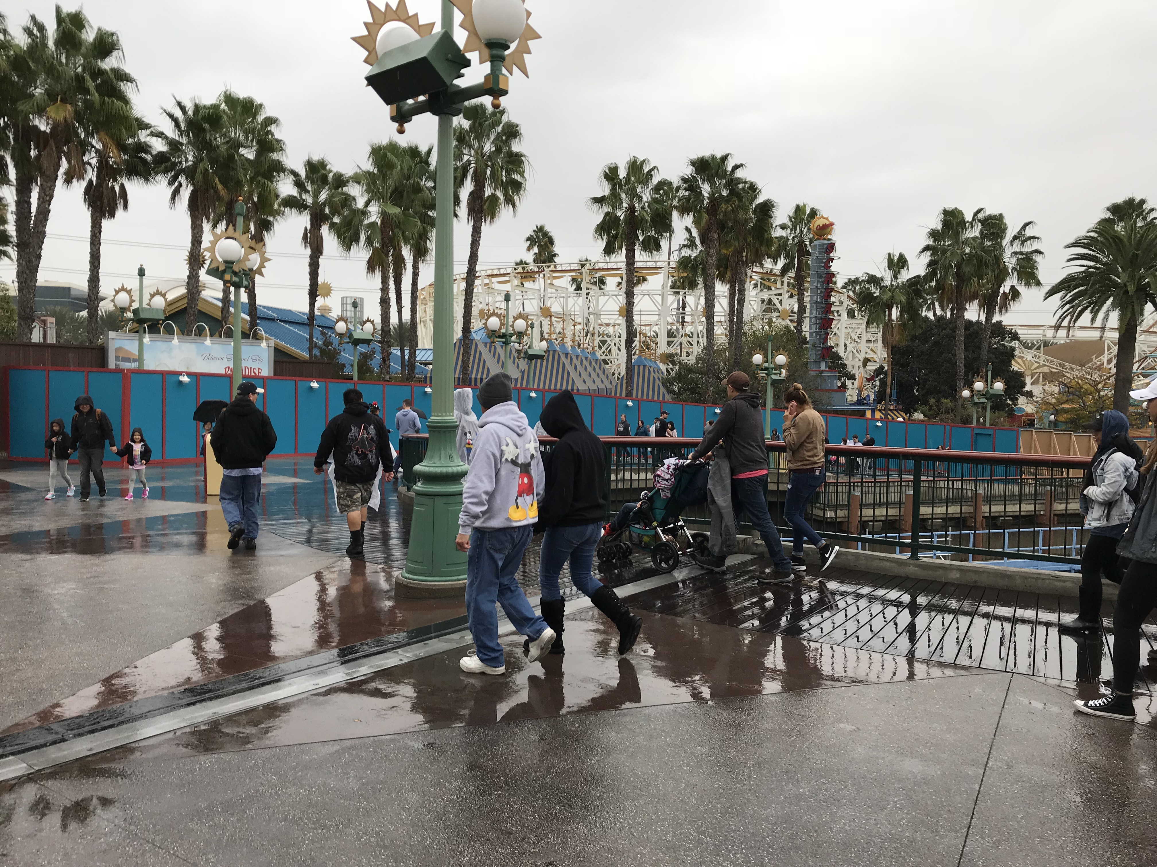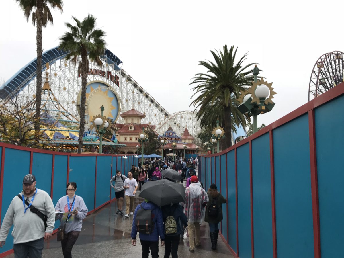 Paradise Pier closed on Sunday and Monday the construction walls went up in the area for the conversion to PIXAR Pier. The work causes the circle that was Paradise Pier to now be a horseshoe shape, which will probably get annoying for guests wanting to get from Toy Story Mania to attractions on the other side.