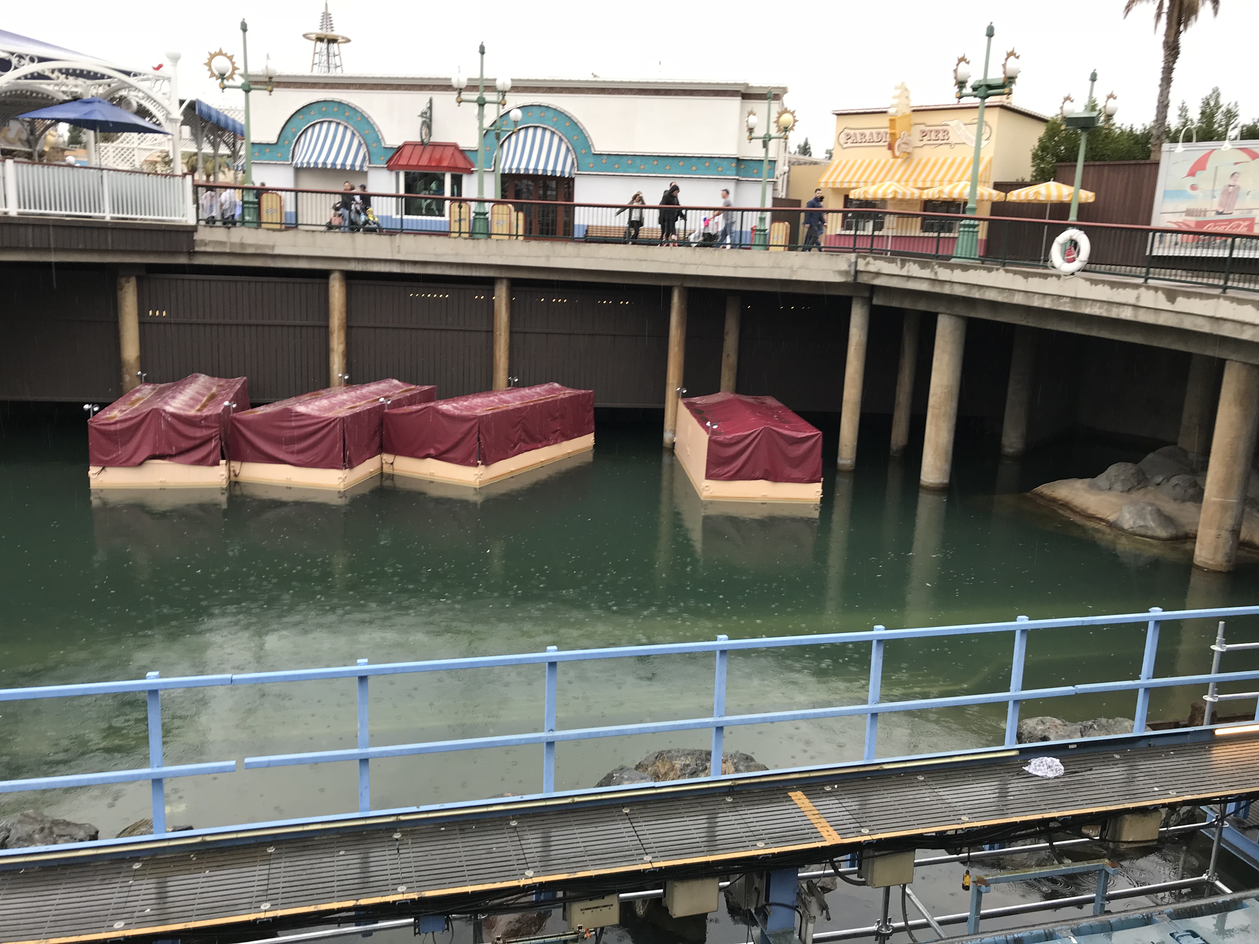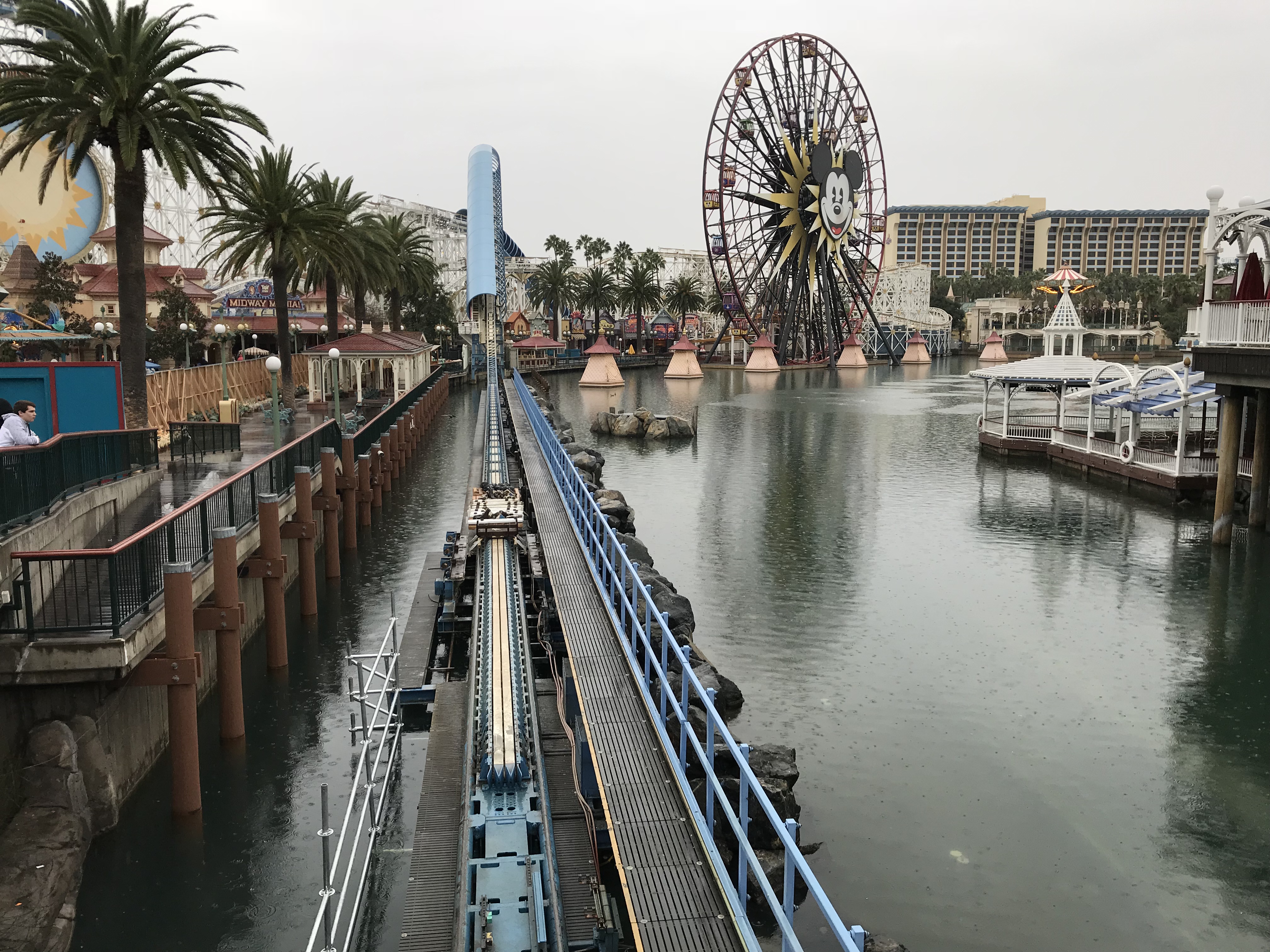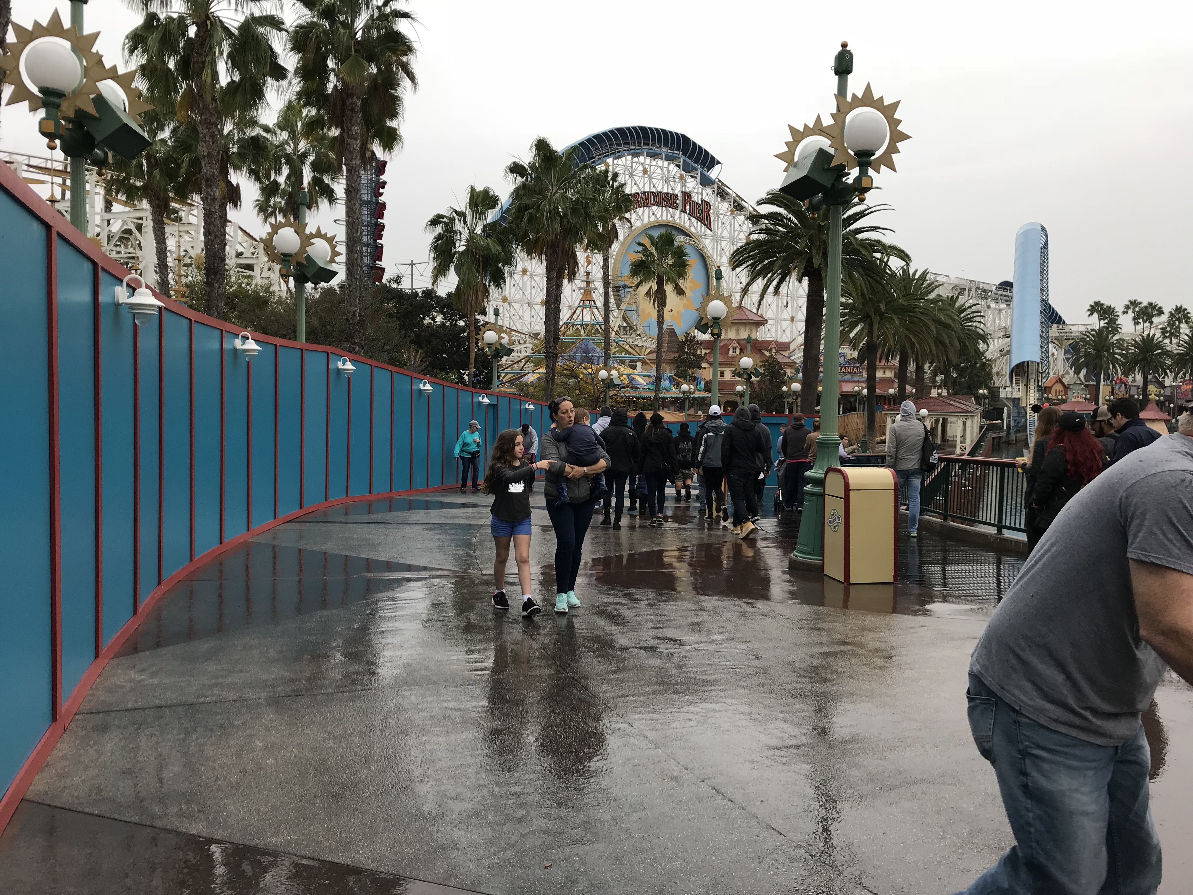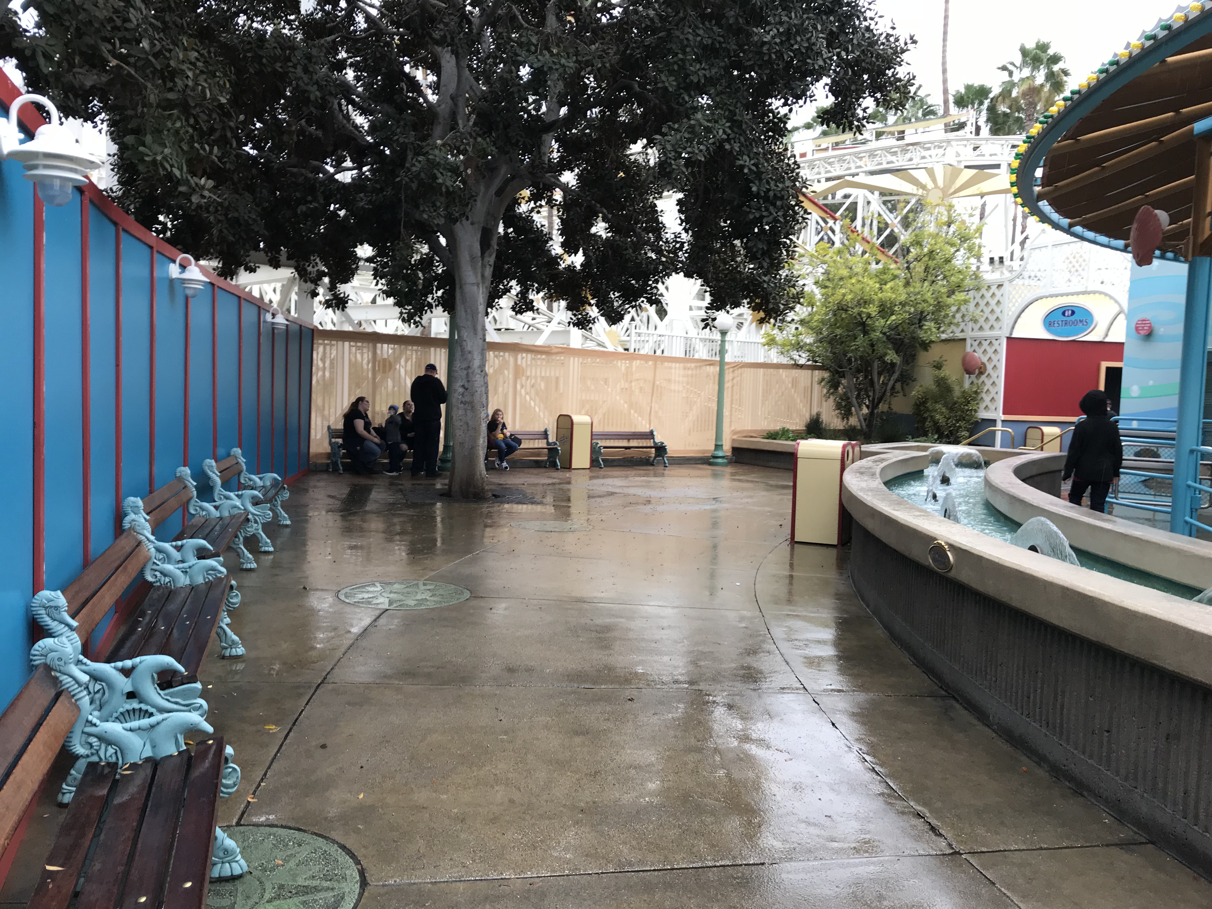 Paradise Pier closed on Sunday and Monday the construction walls went up in the area for the conversion to PIXAR Pier. The work causes the circle that was Paradise Pier to now be a horseshoe shape, which will probably get annoying for guests wanting to get from Toy Story Mania to attractions on the other side.