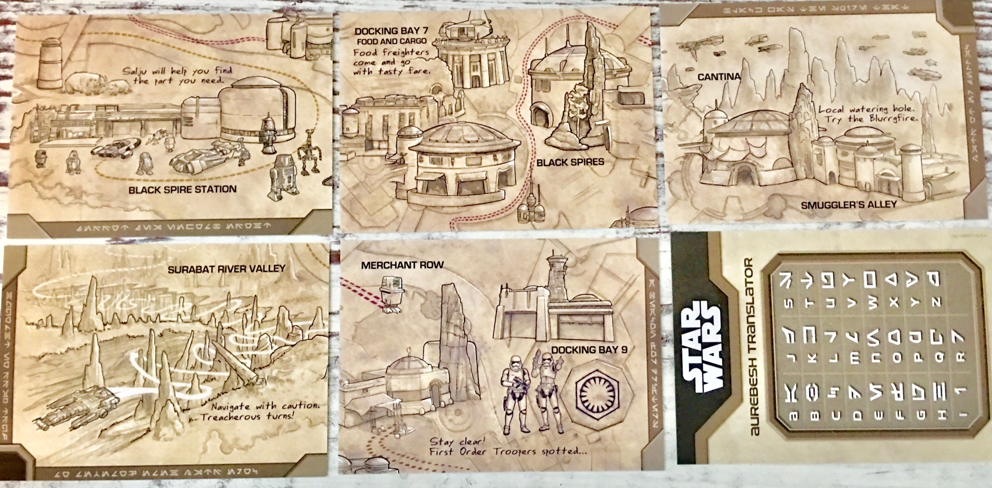 The backs fo the cards showcase pieces of a map of Batuu, showing some of the places guests may visit (from left to right, top to bottom):