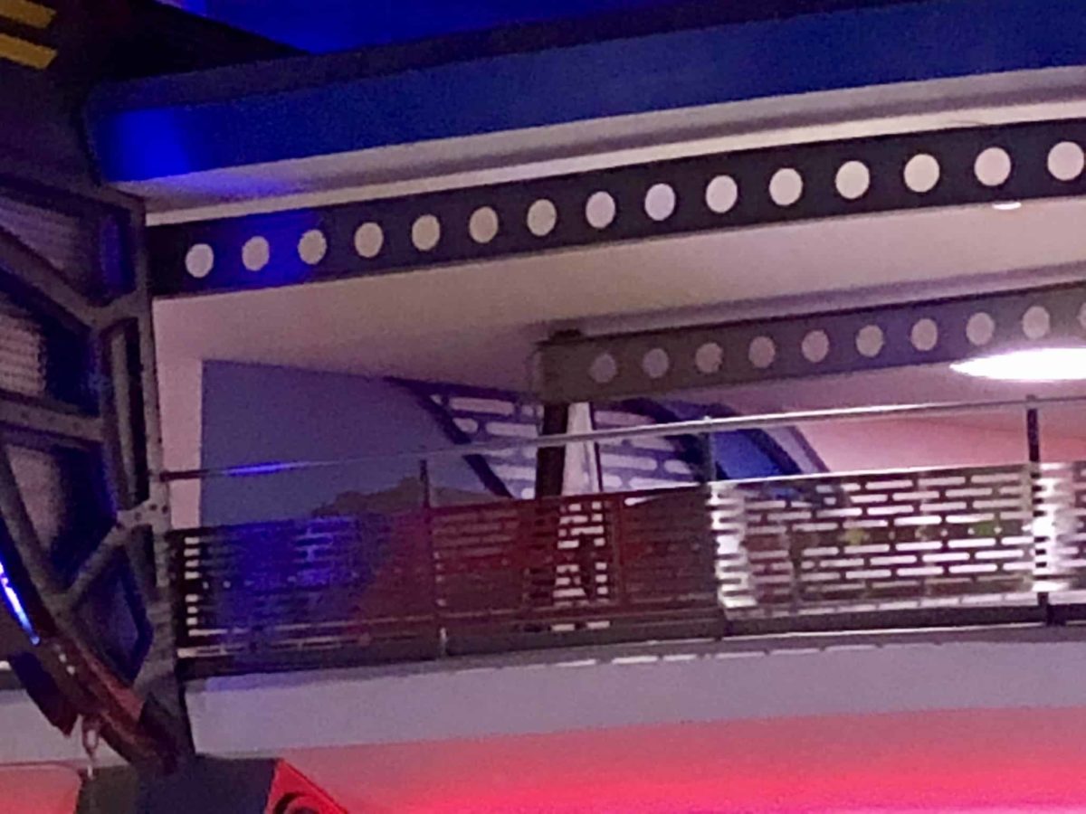 From the Peoplemover, we can see a pattern being painted onto the Monsters Inc. building. The pattern looks a lot like the railings along the Peoplemover path.