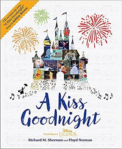 Throughout the book, you read about Walt’s story with whimsical illustrations of his childhood to manhood, and his journey to finding his imagination through the park he would come to build. On some pages, music notes and the lyrics to “A Kiss Goodnight” adorn the pages, prompting you to carry on. And despite the failures he may have encountered during the way, when his dreams came true, the last page is there to remind you that there was always a kiss goodnight. In the back of the book, the lyrics are very simply spelled out so you can read this tribute Sherman made to Walt.