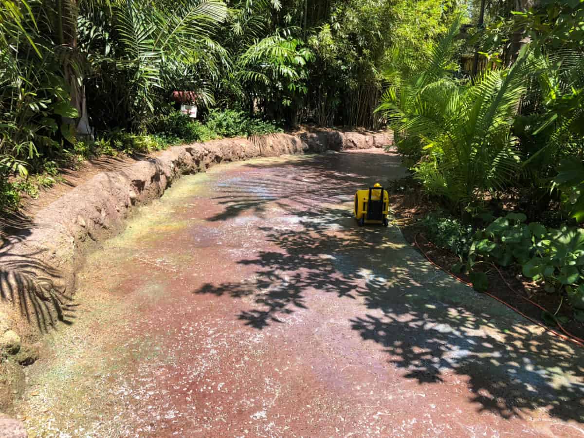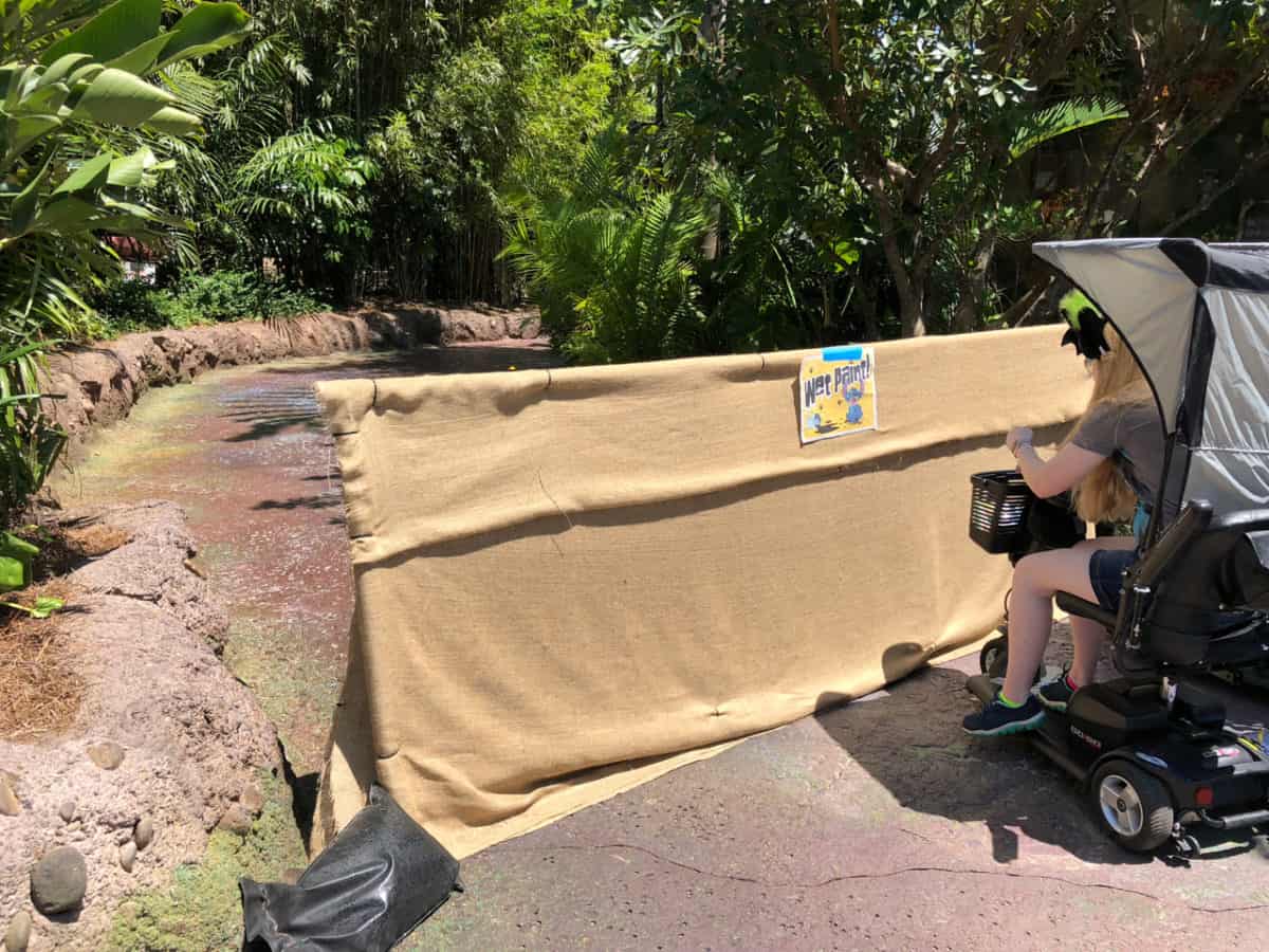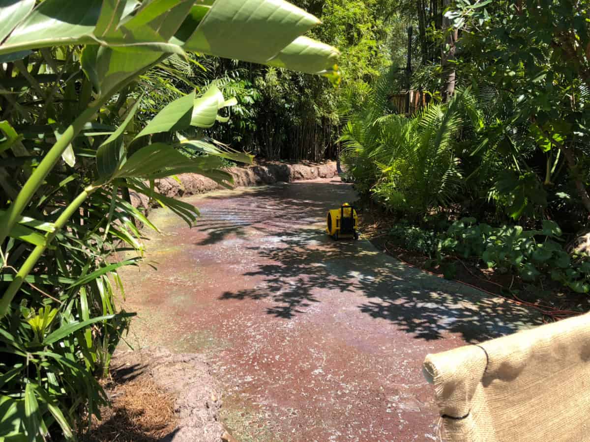 Over to the left of the Pandora entrance by the restrooms, a section of pavement is closed. This section is currently being repainted to bring back the glow that the Pandora floor featured when it originally opened last year. As you can see below, the floor looks much darker, features new colors that glow at night, and seem to have some sort of protective sealant over it. This is probably to protect it from the constant pressure washing the floor undergoes every night for cleaning. We’ll keep you posted to see how this turns out, but we’re glad to see Disney continuing to maintain Pandora.