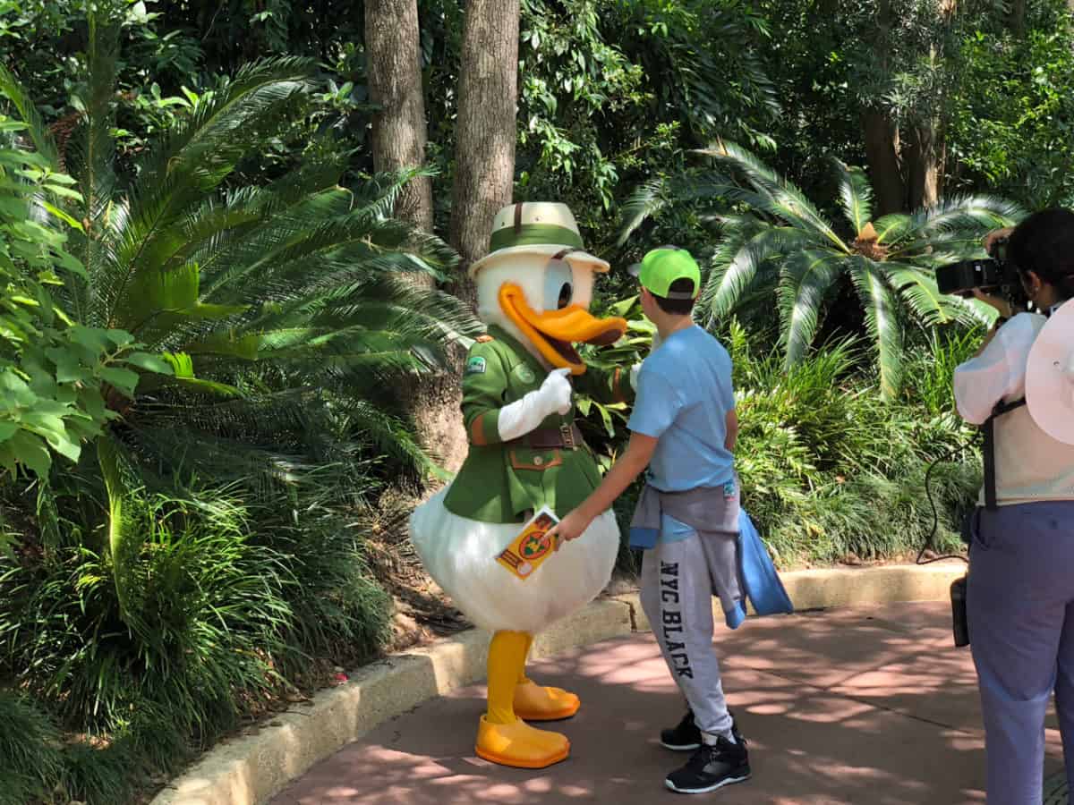 Meanwhile over by the Dino Institute entrance, Donald Duck is meeting guests in his Dino Institute attire.