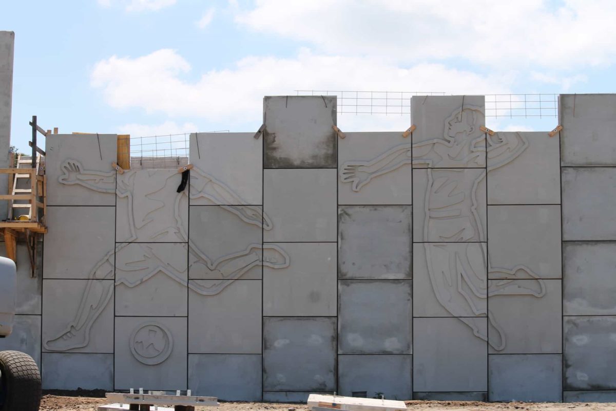 There’s currently major constriction going on across Walt Disney World to alleviate traffic concerns before the arrival of Galaxy’s Edge, Tron Lightcycle Power Run, Guardians of the Galaxy at Epcot, and more. Traffic concerns are prevalent at Hollywood Studios, so a new entrance was announced and is in the process of being constructed. This includes a new cloverleaf design on Osceola Boulevard and Legacy Way, right outside of ESPN Wide World of Sports. Over the past few days a design, showing a volleyball and soccer player, has emerged. Compared to the regular bland retaining walls near Disney Springs, these are fun and themed.