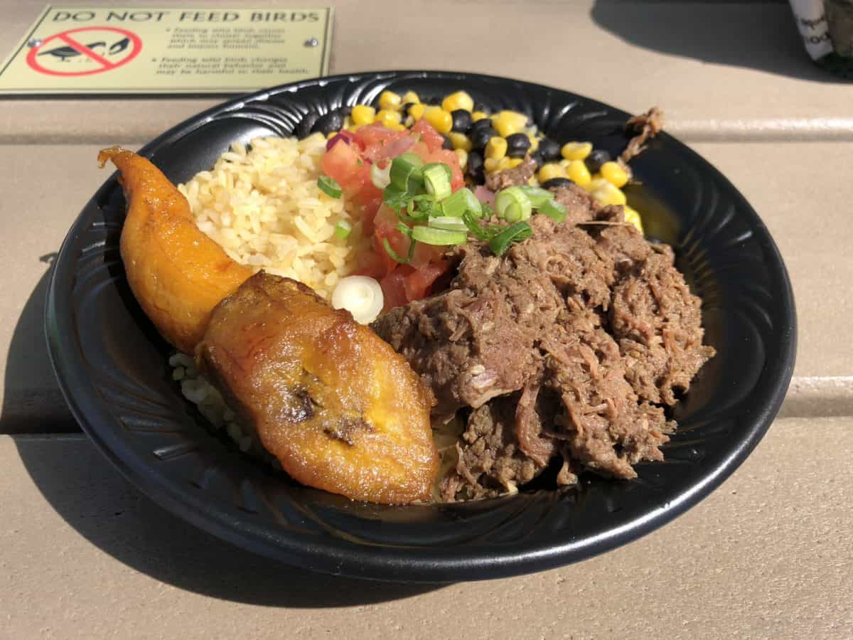 These bowls are HUGE. Pictures don’t do justice to the massive bowl and portion of food. The plantains are cooked perfectly, leaving them nice and tender. There’s a huge portion of rice, corn, and black beans below the scoop of beef. We felt the beef, while good, wasn’t as amazing as the adobo chicken.