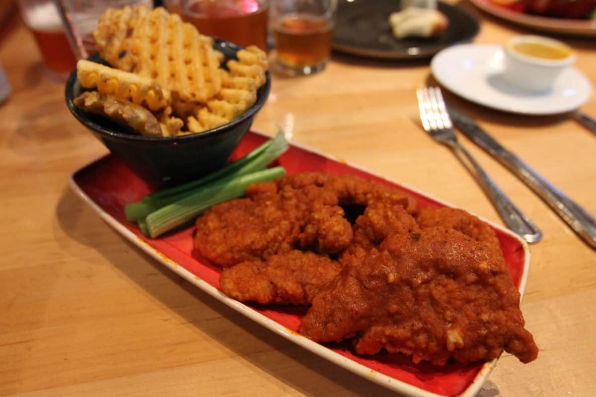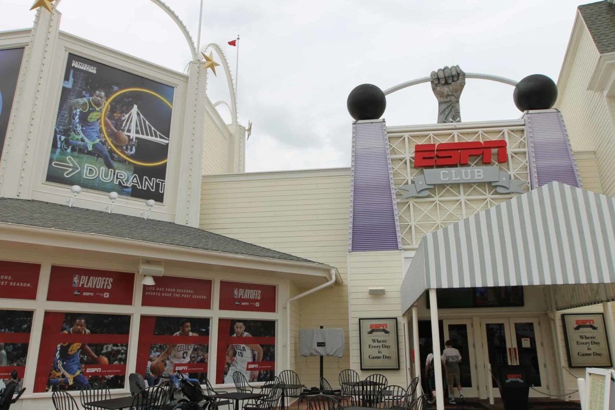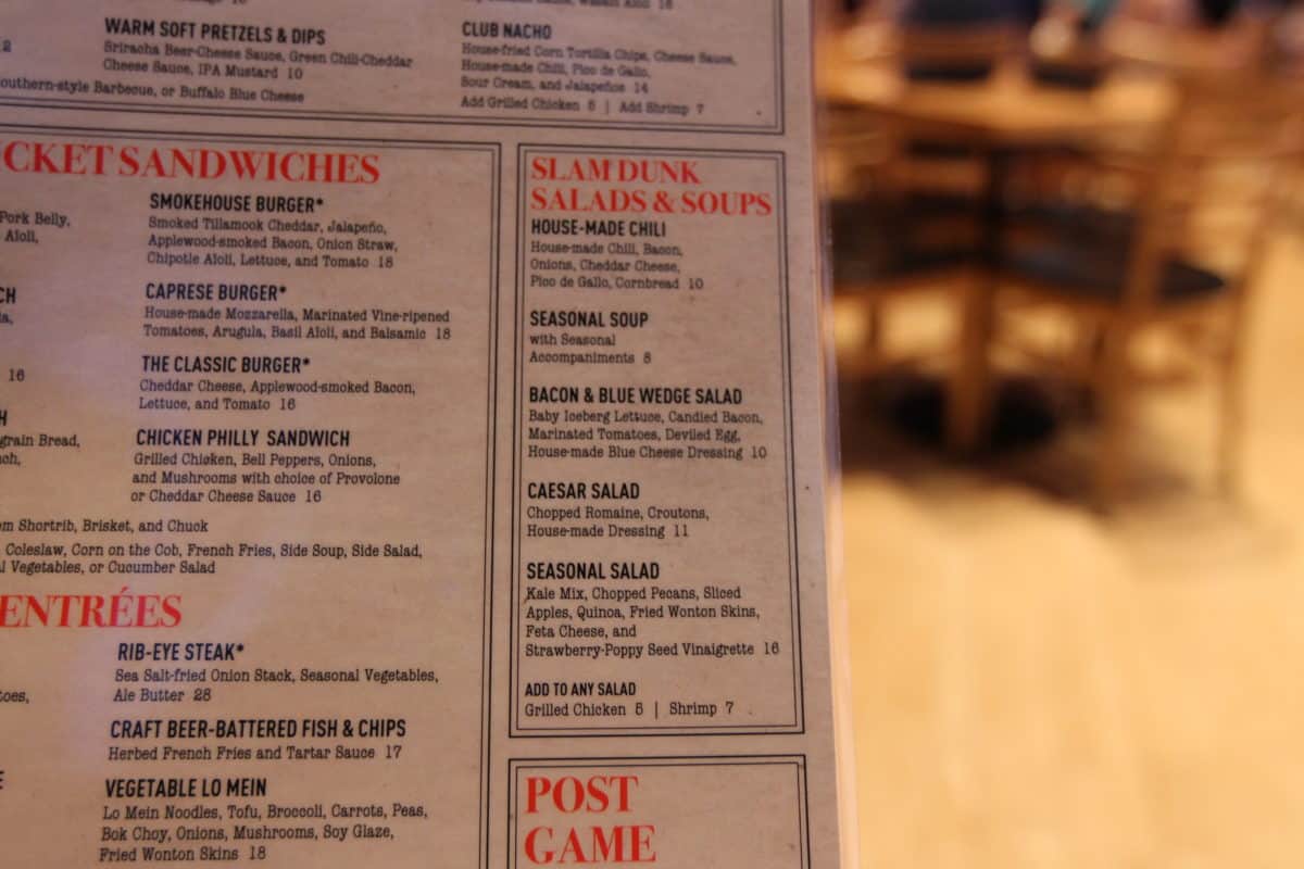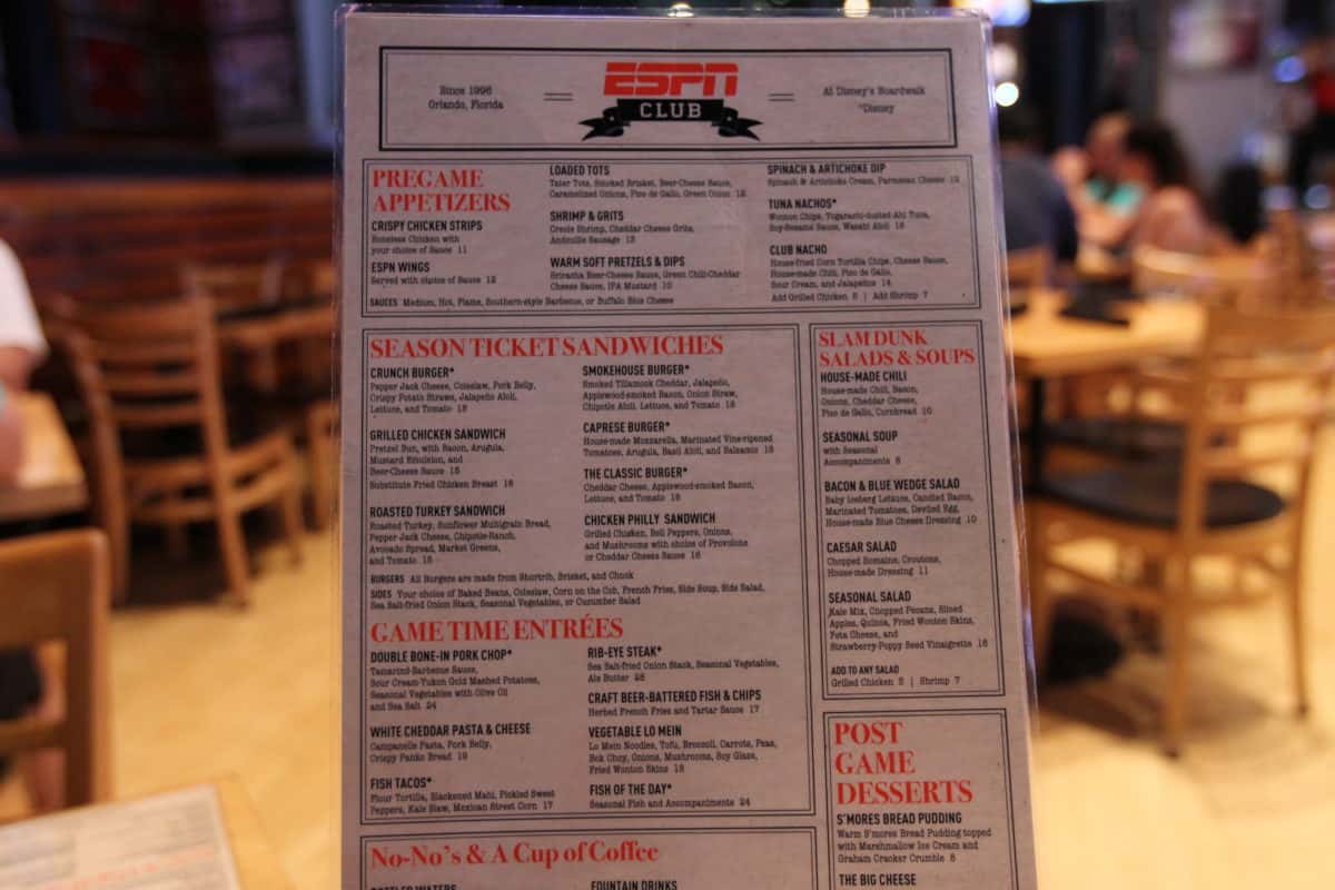 ESPN Club is a table service restaurant at Disney’s Boardwalk Resort. While not necessarily anyone’s first round draft choice of where to have dinner, the restaurant has many redeeming qualities. There’s an extensive beer menu, great sandwiches, and a plethora of TVs that are EVERYWHERE. They are literally everywhere, even in the restrooms and stalls. We’ve long been fans of the ‘ESPN Dingers’ boneless wings, but recent menu changes flipped out the boneless wings for chicken tenders. We stopped by this week to play ball and check out the new entrees.