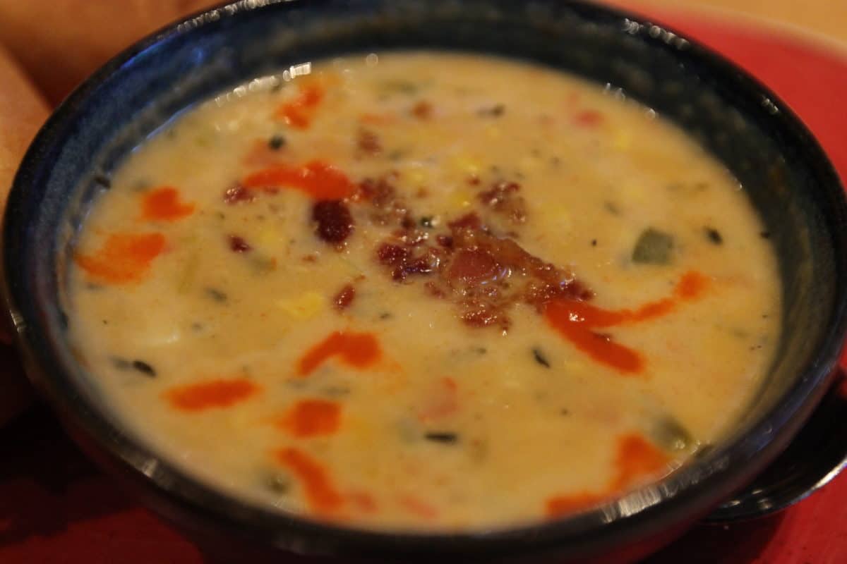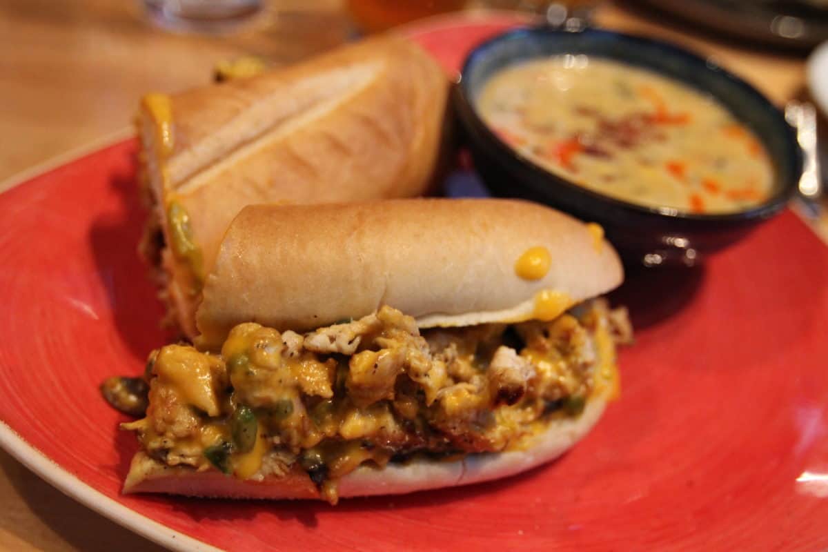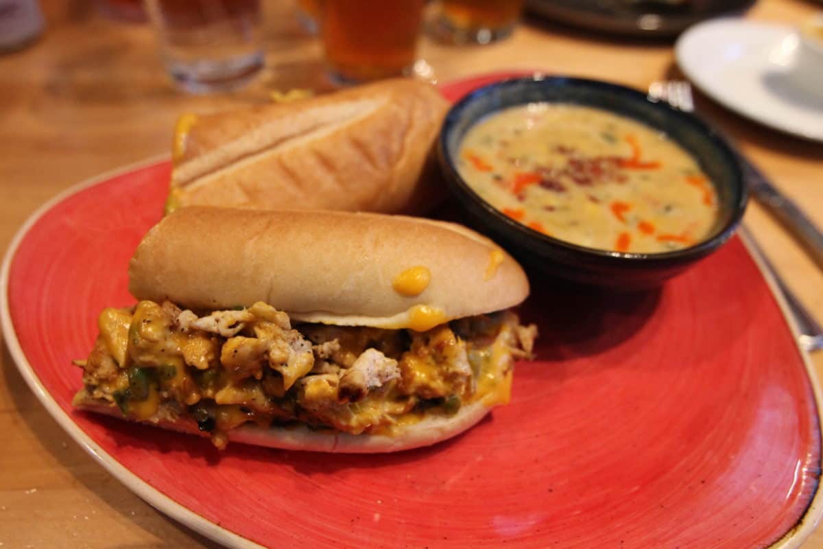 Ordered here with the cheddar cheese sauce. One of the very cool things about ESPN Club is their side menu items list. Not only do you have french fries and onion rings, but you have the ability for a side salad or soup. No other Disney operated location allows you to flip out the side for a soup or salad like this. We opted for the seasonal soup as a side; a corn chowder. Plenty of spice and great flavor all throughout. As for the sandwich, there’s large chunks of chicken assembled on a bun that resembles a chicken cheesesteak. It’s packed with mushrooms and peppers making each bite have a distinct crunch and wonderful flavor. Next time we would get the provolone instead of the cheese sauce. After a while everything became too slippery to stay inside the bun.