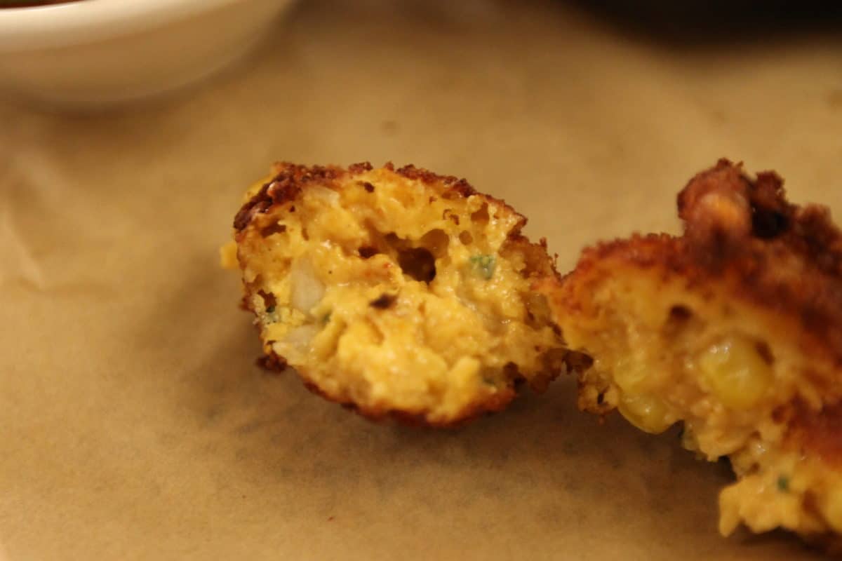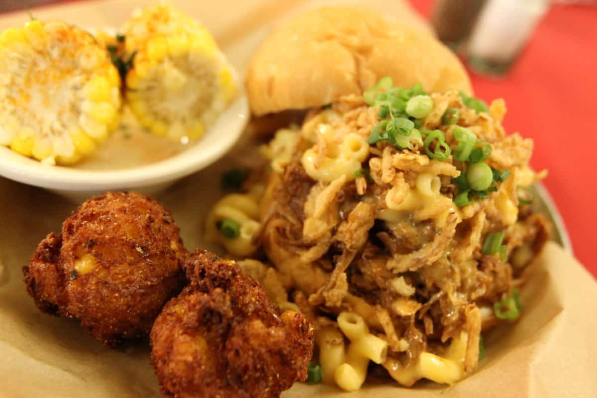 All entrees are served with a few corn fritters and one side from The Fix ‘Ins list. We opted for Corn on the Cob as a side which was a fantastic choice. Instead of one large piece you get a few small ones making for some quick nibbling. The corn fritters are filled with pimiento cheese that gives a great spicy kick; they’re fantastic. This sandwich is mostly pork with a scoop of mac and cheese on top and some fried onions. Impossibly difficult to pick-up and eat like a burger, we resorted to eating this one with fork and knife after the pile fell apart. The pork is very tender and has a great smokey flavor.