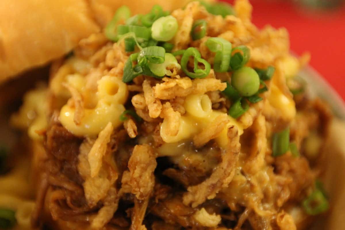 BBQ Pulled Pork Sandwich – with Mac and Cheese and Crispy Onions on a Brioche Bun – $17.00