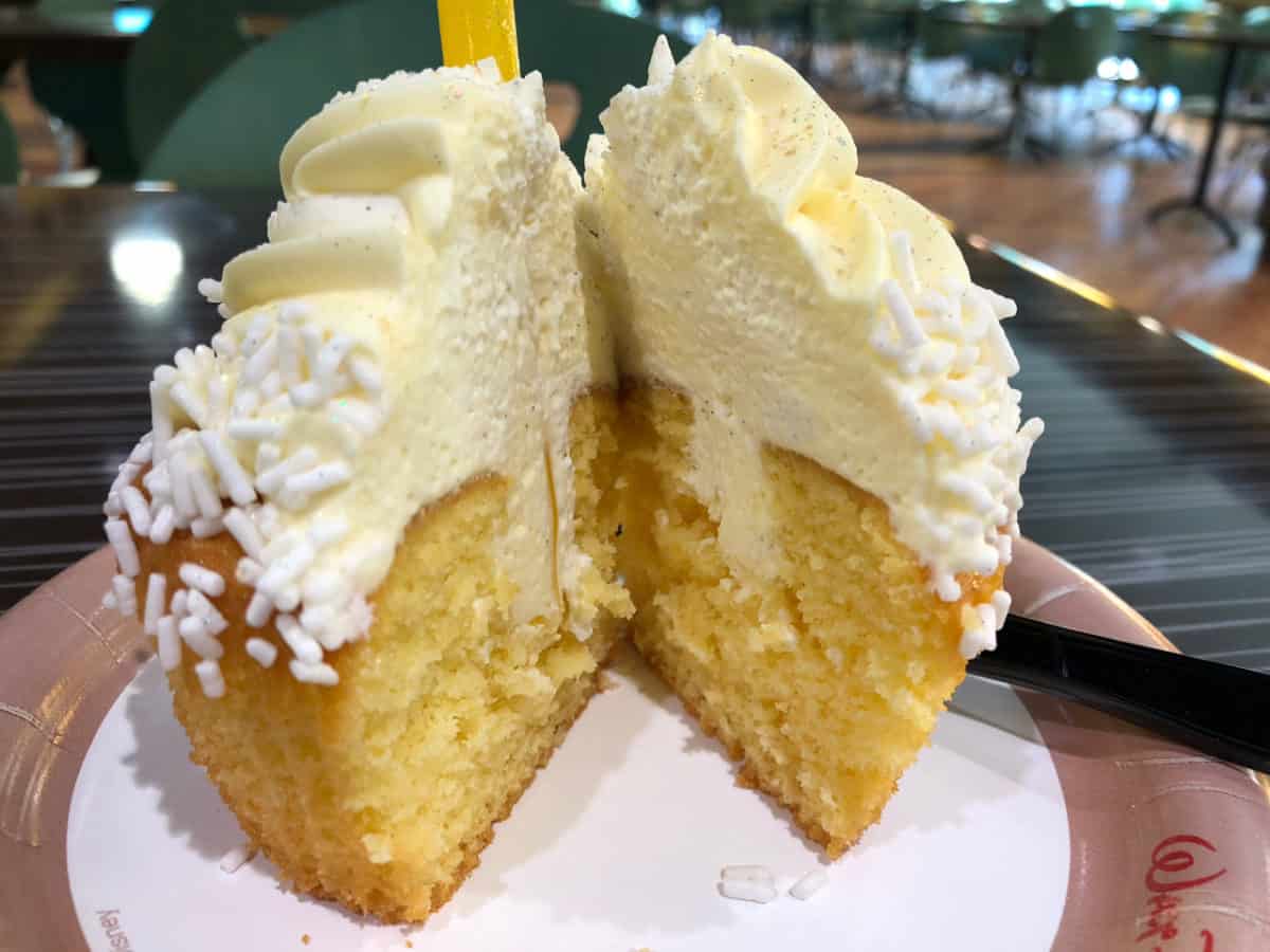 This is pretty much like eating a Dole Whip cupcake, which is perfect for me because I love Dole Whips and if you’re a fan of them, we highly recommend you grab one. This cupcake is available at Intermission Food Court for $5.49 for a limited time.