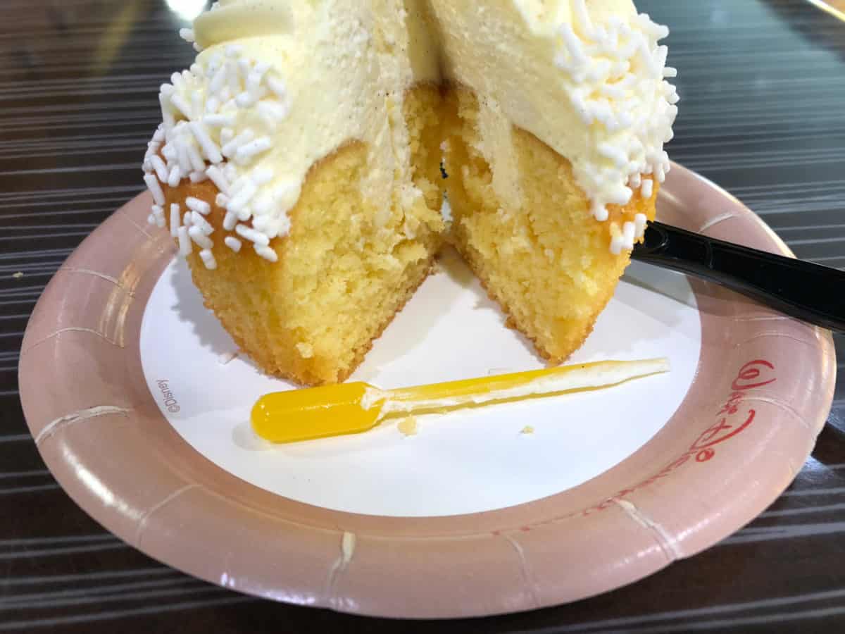 The cupcake is a yellow cupcake with swirls of vanilla and pineapple cream topped with white sprinkles and gold dust. Additionally, the coolest part of this cupcake is the dropper of pineapple whip gel which you can “inject” into the cupcake and make it delicious.