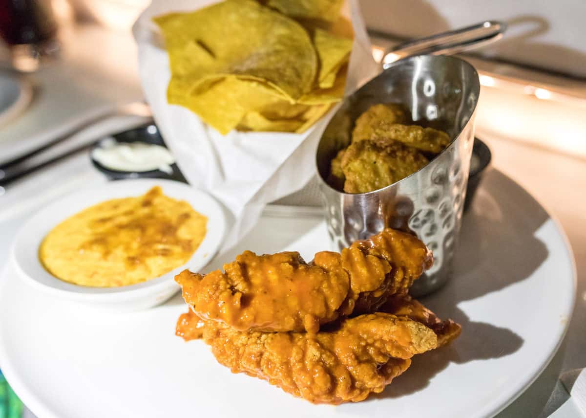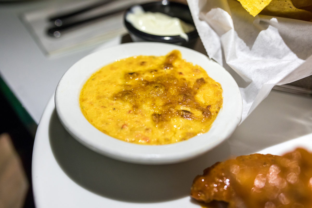 There’s a new sauce for the tenders, (boneless wings are nuggets, so boneless tenders are just tenders) so we tried the Szechuan sauce. This isn’t a McDonald’s ad; this sauce is very different and much more complex. Subtle sweetness and a good spice encapsulated the tenders and made for some great tasting chicken. There were a lot of chips provided for the shrimp and crab fondue, which came out perfectly hot. Rounding out the trio are the frickles. Fried pickles? Frickles. The frickles were lightly coated with a breading and quickly fried giving a nice crunch.