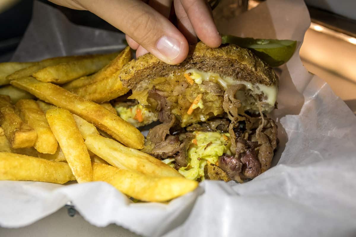 Smoked Prime Rib Sandwich – Pastrami-style Smoked Prime Rib served on Grilled Marble Rye with Grain Mustard Coleslaw, Caramelized Onions, and Swiss Cheese – $17.00