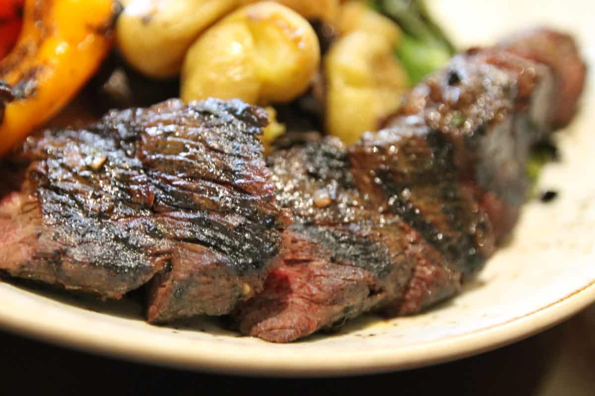 Roman-style Steak – Grilled 8-oz Angus Hanger Steak, Caramelized Onions, Rosemary-crushed Potatoes, and Local Vegetables – $32.00