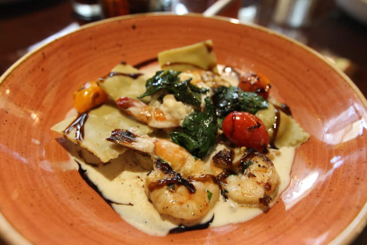 Ravioli with Grilled Jumbo Shrimp – Cheese-filled Ravioli with Seasonal Vegetables and Sun-dried Tomato-Pesto Cream – $30.00