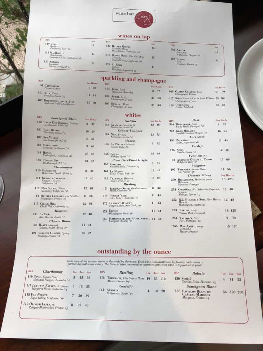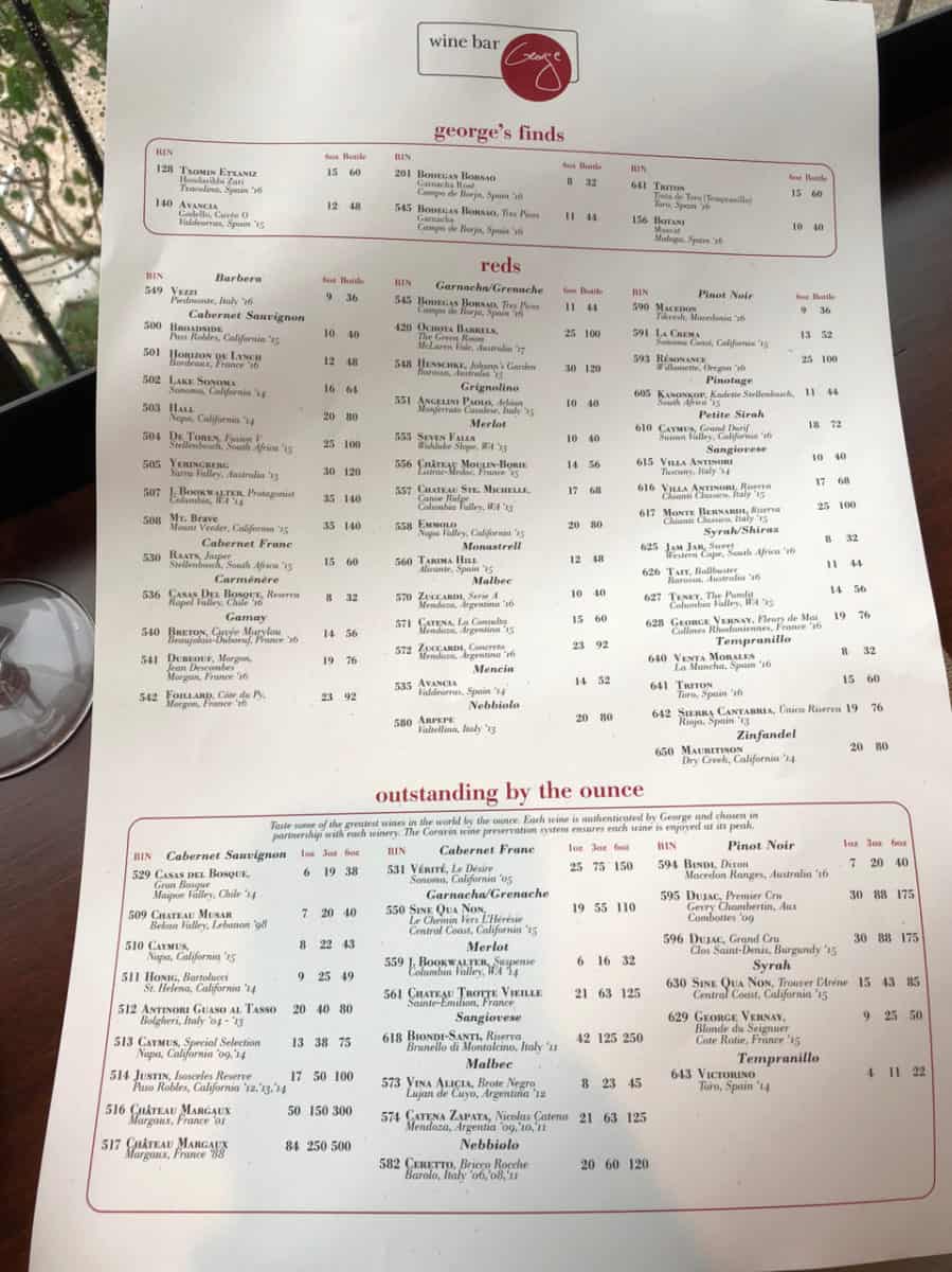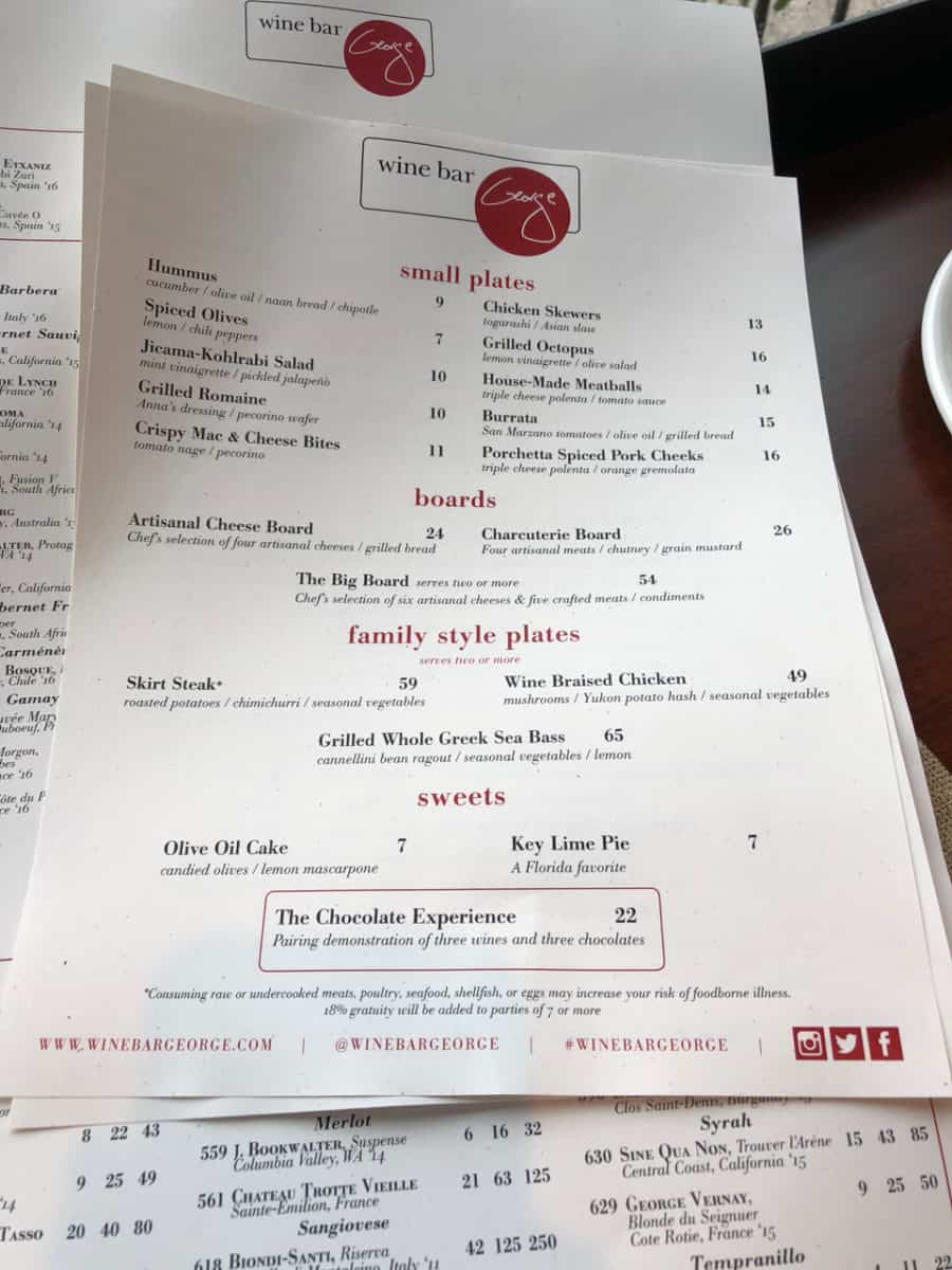 Wine Bar George offers a relatively small food menu with small plates and cheese boards, and also offers three family-style plates (large plates?) that can be shared by 2-4 people. As expected, there is a very extensive wine menu with over 100 different type of wines, plus specialty cocktails and a selection of beers (although I’m not sure what demographic they are targeting with Bud Light on there).