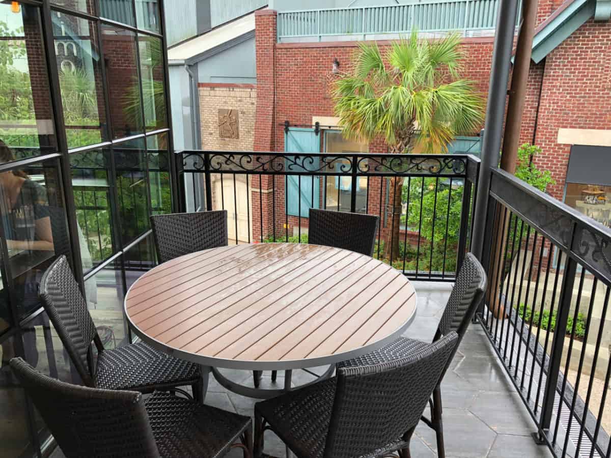 The outdoor area upstairs was open for guests and yes, the tables near the railing do get wet if it starts raining sideways.