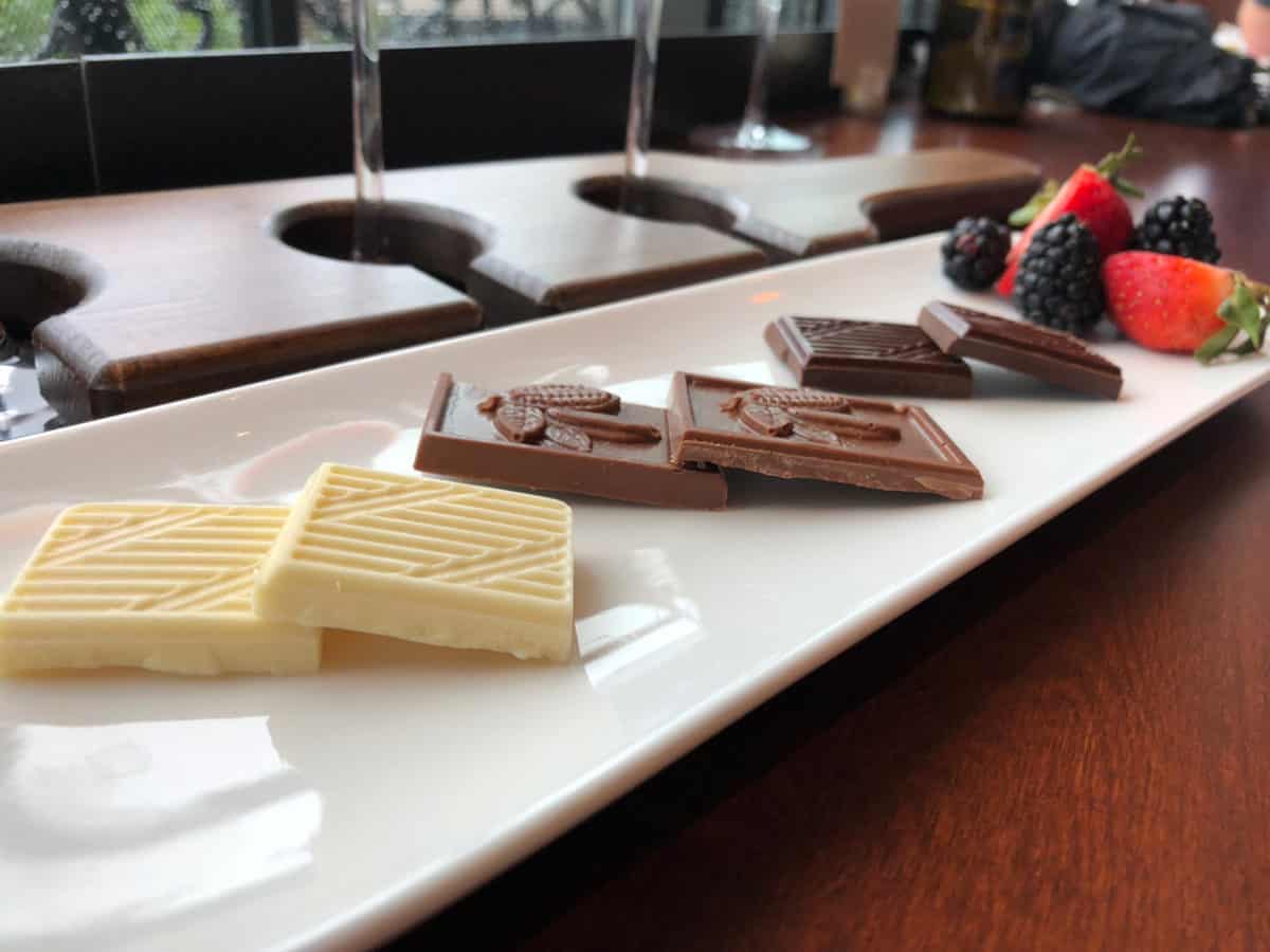 The Chocolate Experience offers 3 different chocolates: white chocolate, milk chocolate, and dark chocolate. These are house-made and but are on the small side. The three different wines are as follows (from left to right):