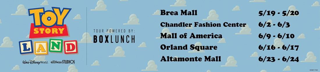The Toy Story Land Tour begins on May 19th in SoCal and will conclude on June 24th in Central Florida prior to the grand opening of Toy Story Land on June 30th. The mall tour will include a variety of cool interactive exhibits, photo booths, sneak peeks of Toy Story Land, giveaways, and limited edition merchandise available for purchase similar to what you can find on the BoxLunch website. Additionally, the Pizza Planet Truck replica will also be available for photos at the tour locations.