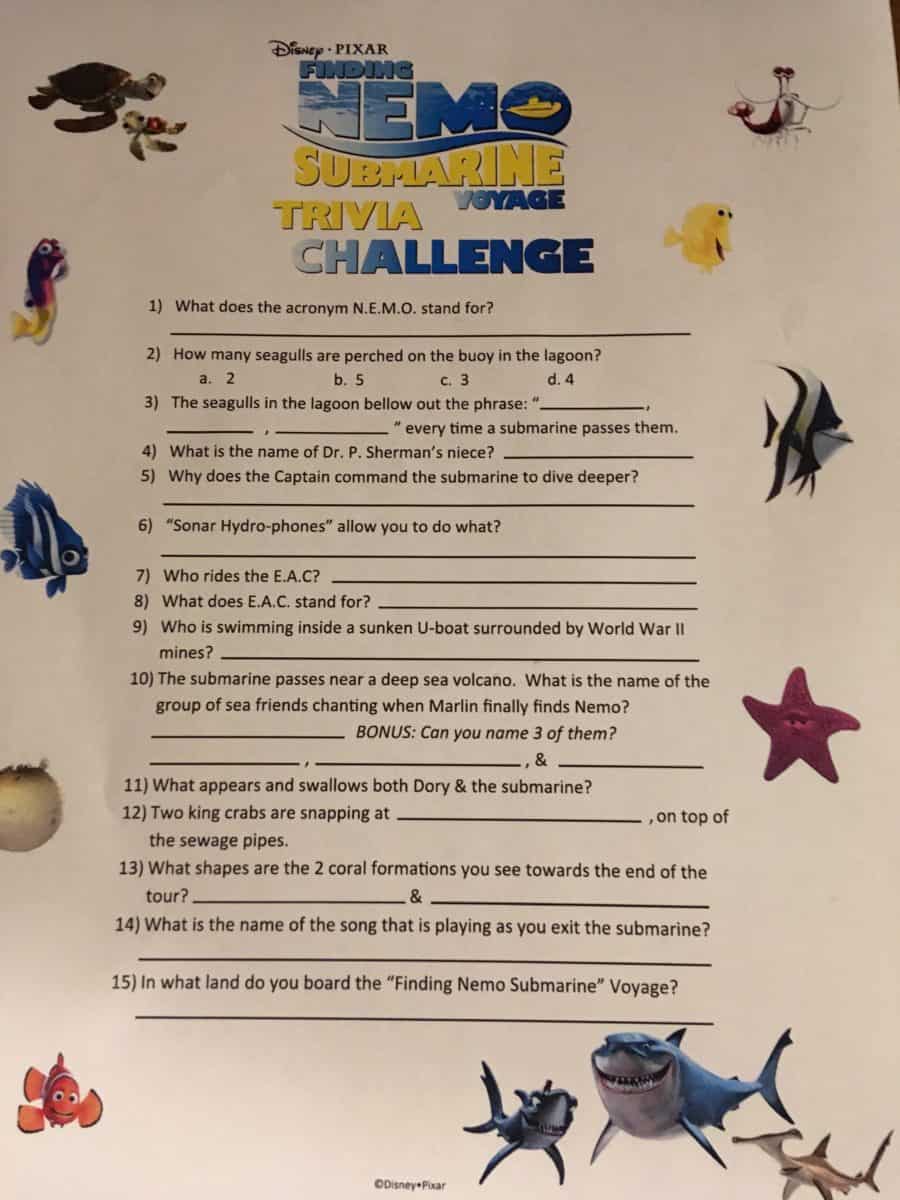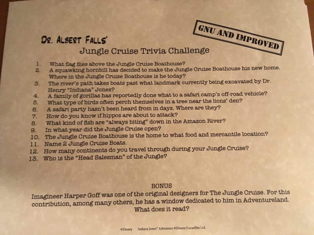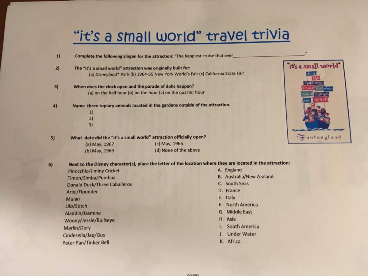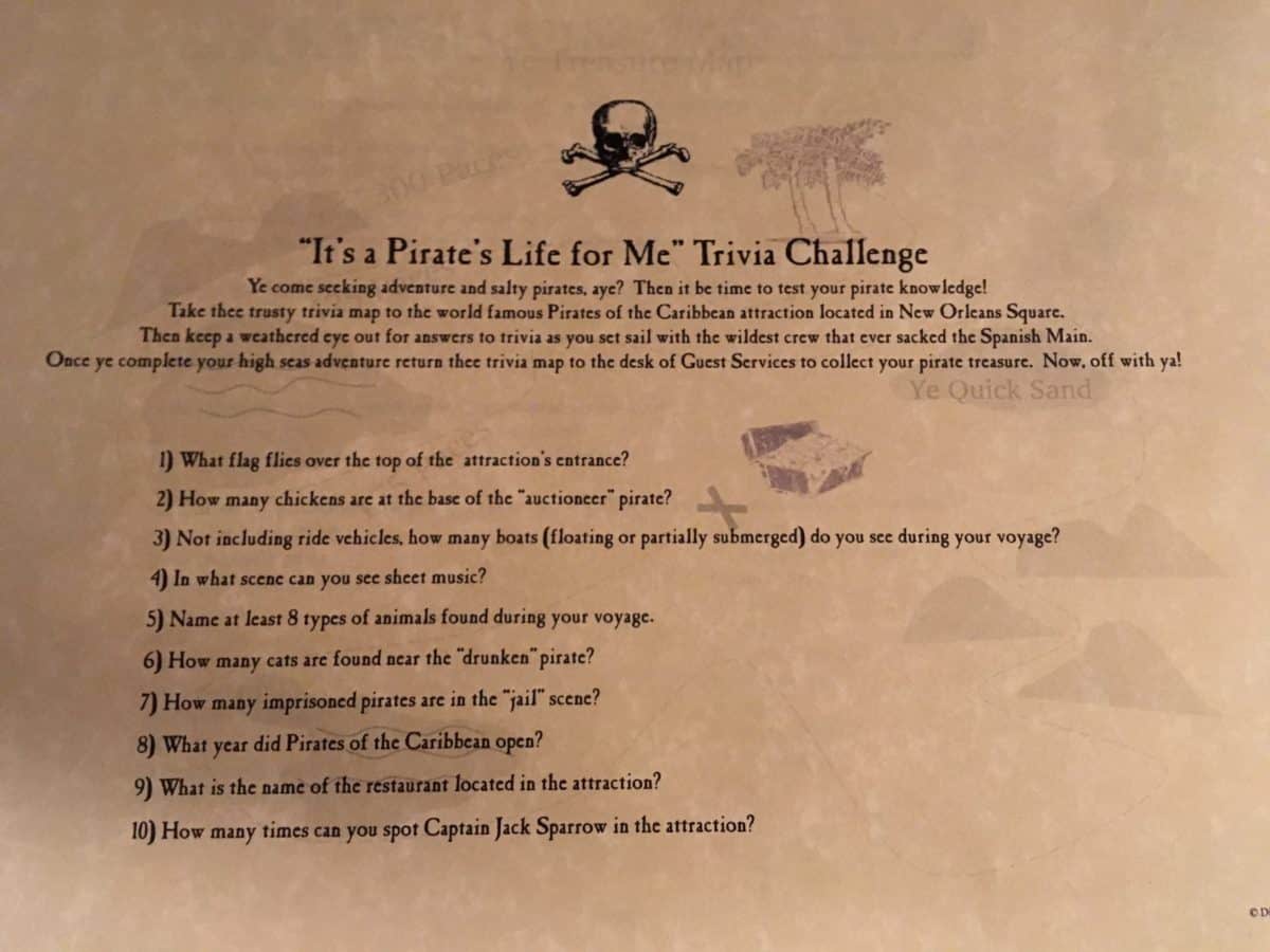 One of the better kept secrets of the Disneyland Resort hotels are the exclusive activities they offer to guests of said establishments. Some have a fee to participate, but my favorite is free of charge and found at the Guest Services desk. It is the Trivia Challenge, a self-guided quiz focused on four attractions: Pirates of the Caribbean, it’s a small world, Finding Nemo Submarine Voyage, and Jungle Cruise. Guests are given one sheet of trivia questions for each attraction and the idea is to find the answers while riding them. You aren’t penalized any wrong answers, but the cast member at the desk does have an answer key if you are curious.