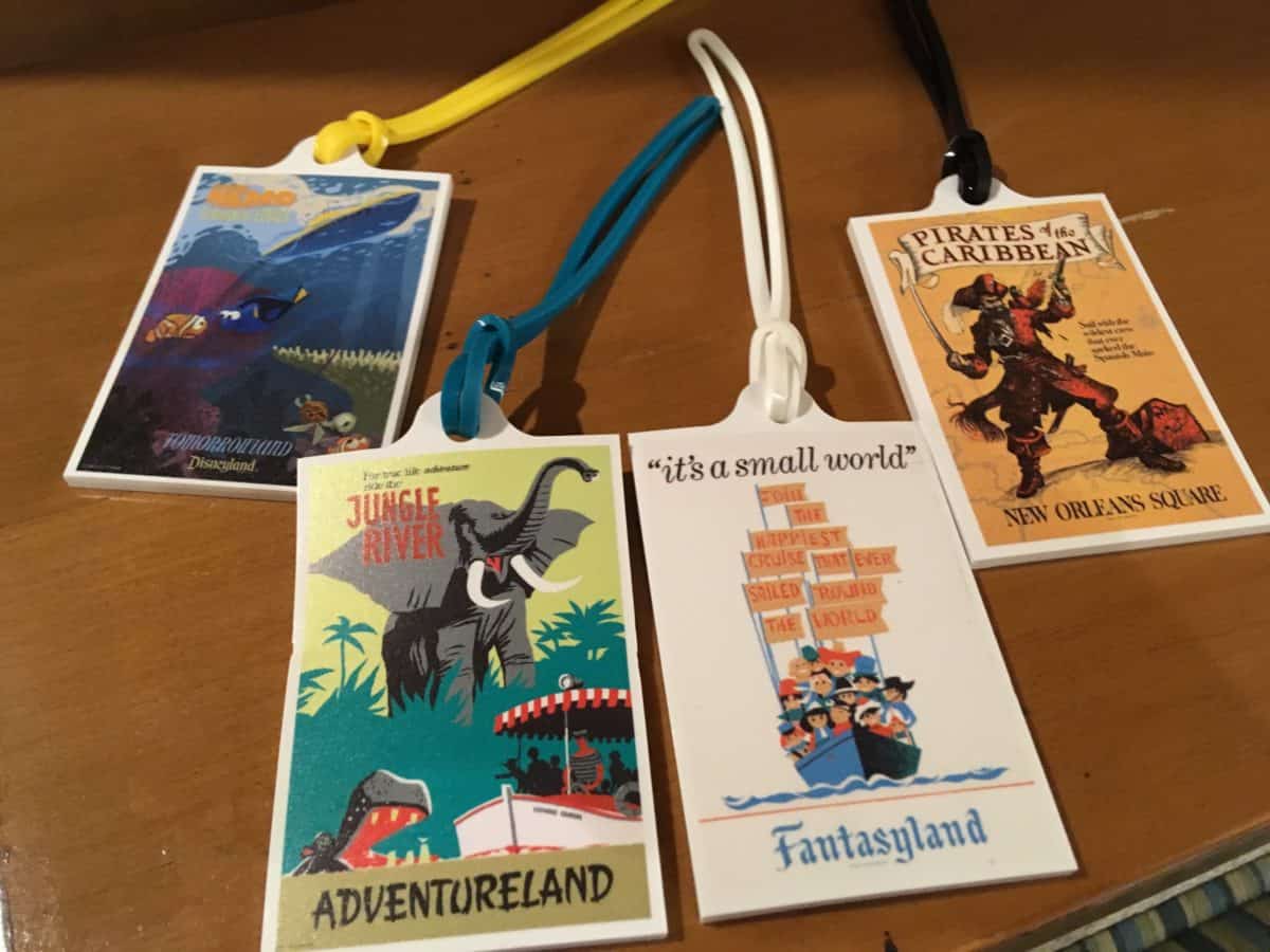 Behold, the Trivia Challenge prizes! For all that hard work, participants are rewarded with sturdy luggage tags that bear the poster art for each of the attractions from the Trivia Challenge.