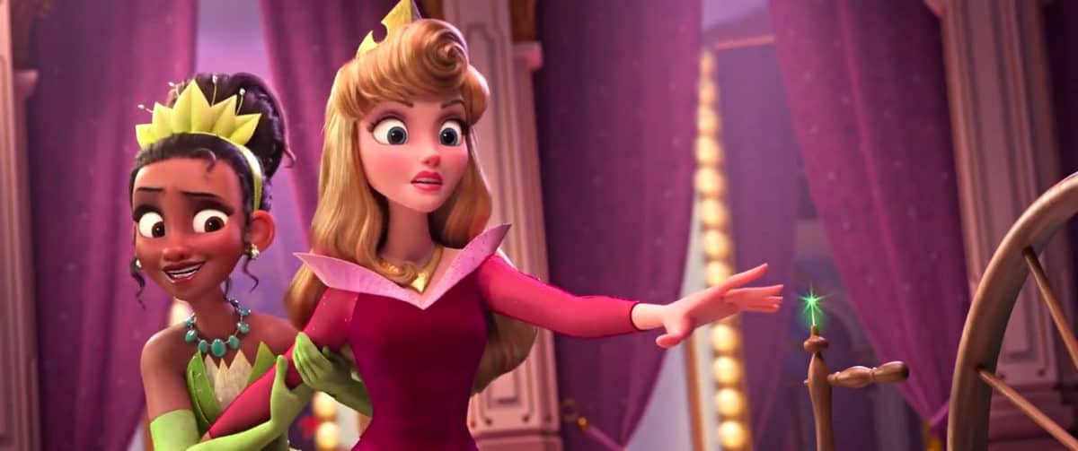 Tiana pulls Aurora away from the spinning wheel spindle before she gets herself in trouble again.
