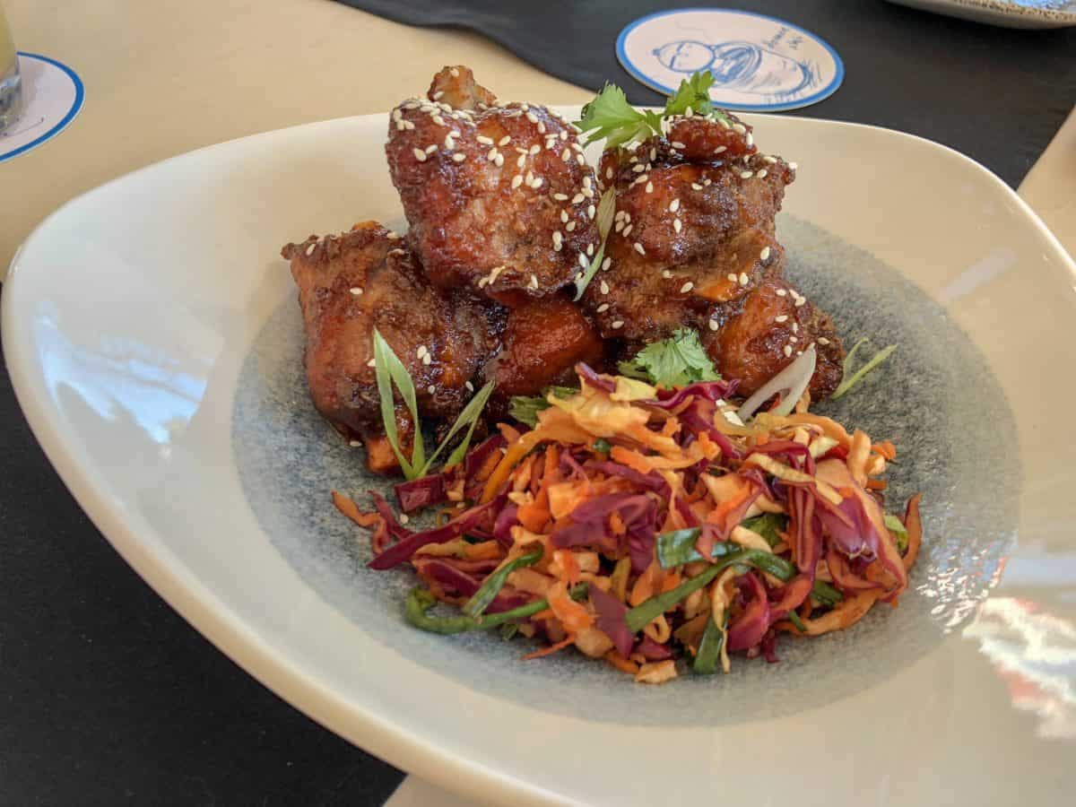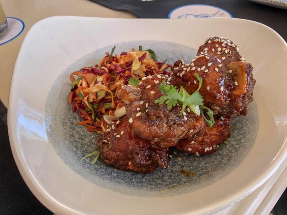 Crispy Piggy Wings – Pork Drumettes with Chili-Ginger Glaze, Toasted Sesame Seeds, Cilantro, and Slaw – $17.00