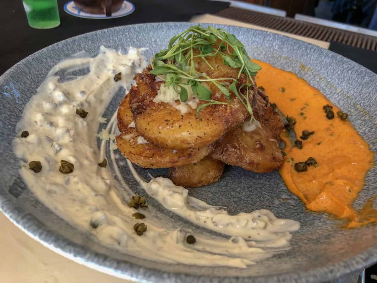 Potato Skins – crispy Yukon Gold Potatoes with Brown Butter-Caper Yogurt, Smoked Paprika Aïoli, and Manchego Cheese – $14.00