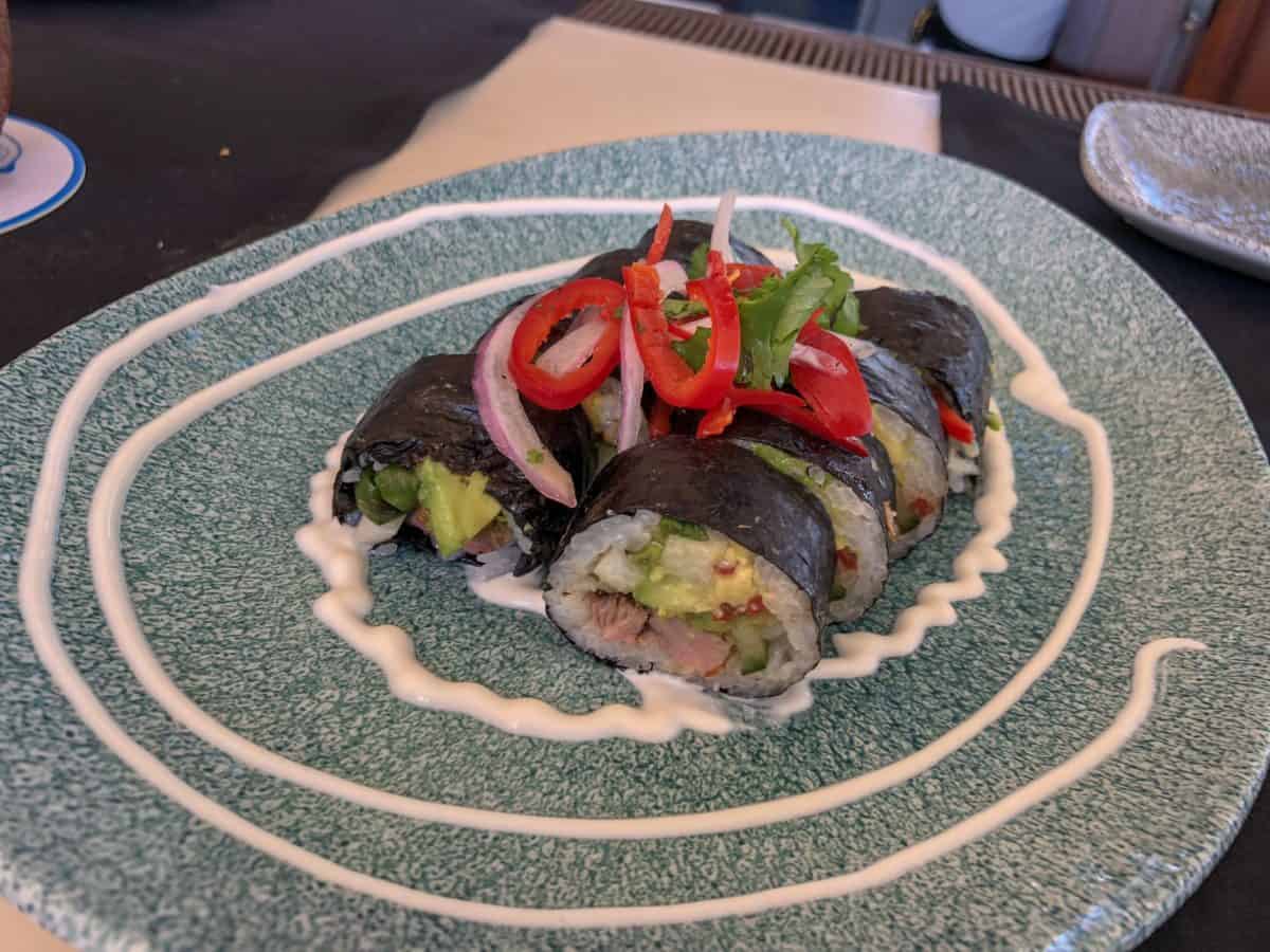 Carne Asada Roll – Grilled New York Strip Steak, Roasted Fresno Chili Salsa, Escabèche, and Crema – $17.00