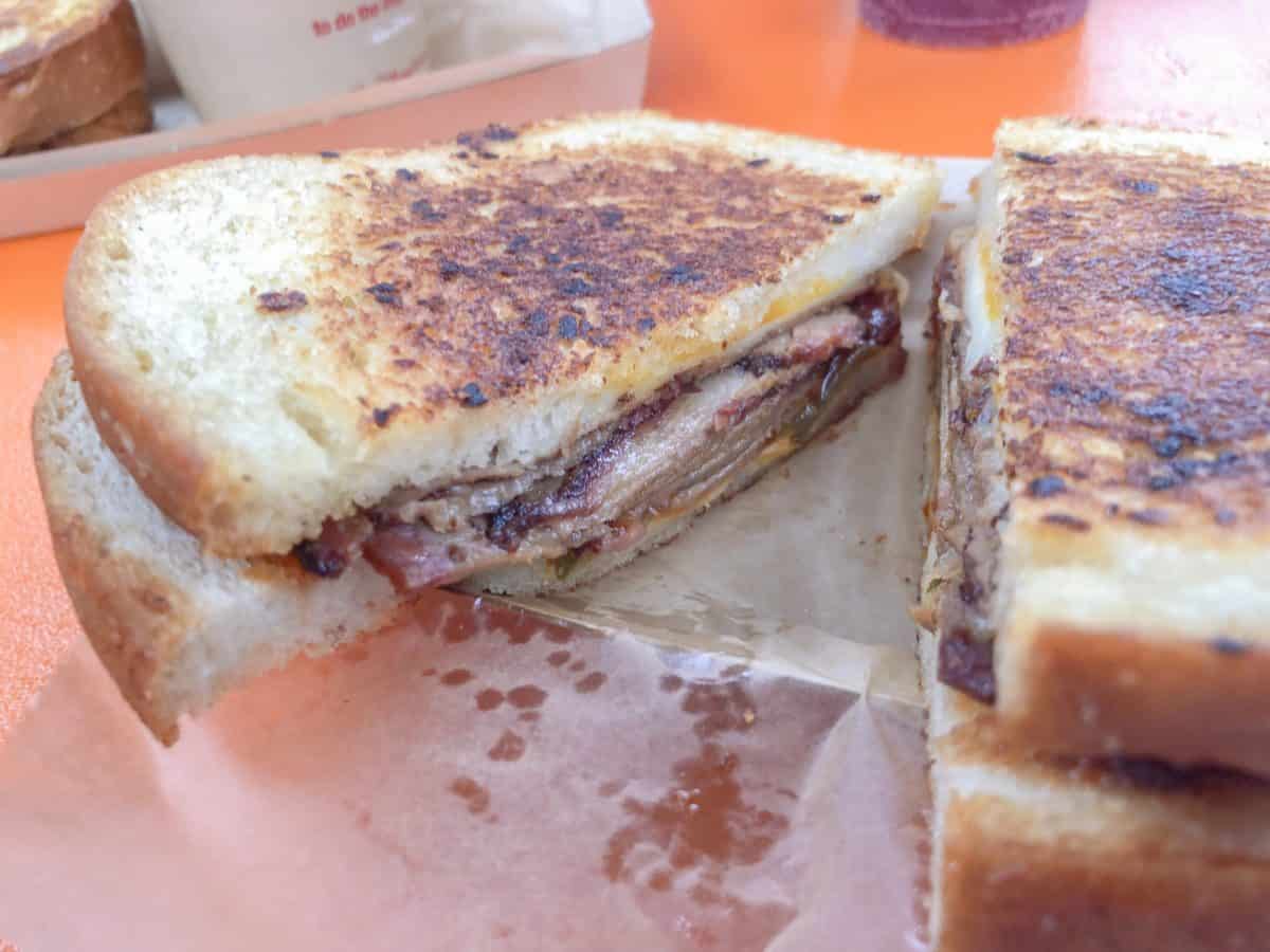 BBQ Brisket Melt -Sliced Smoked Brisket, Pickles and tangy BBQ Sauce between melted Cheddar and Monterey Jack Cheeses on Grilled Sourdough -$12.99