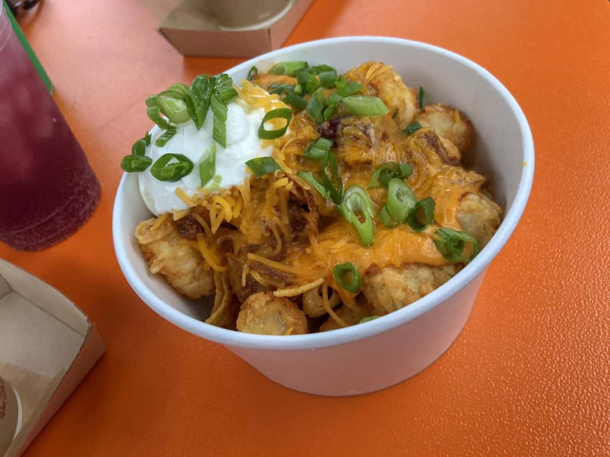 “Totchos” – Potato Barrels coated with Beef and Bean Chili, Shredded Cheese and signature Queso with Tomatoes and Corn Chips finished with Sour Cream and a sprinkle of Green Onions -$8.99