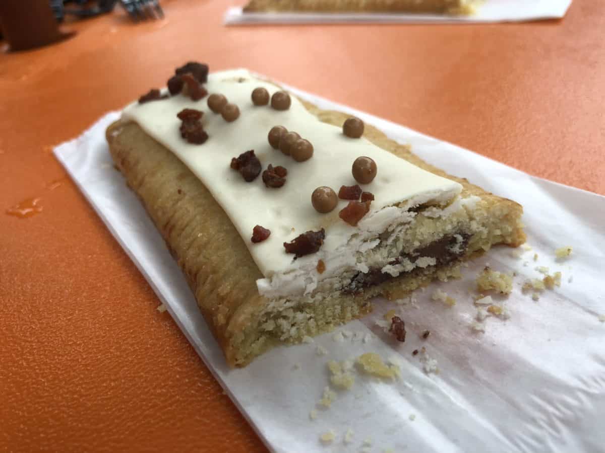 Chocolate-Hazelnut Lunch Box Tart – Chocolate-Hazelnut stuffed Pastry coated in Maple Fondant and Candied Bacon -$3.29