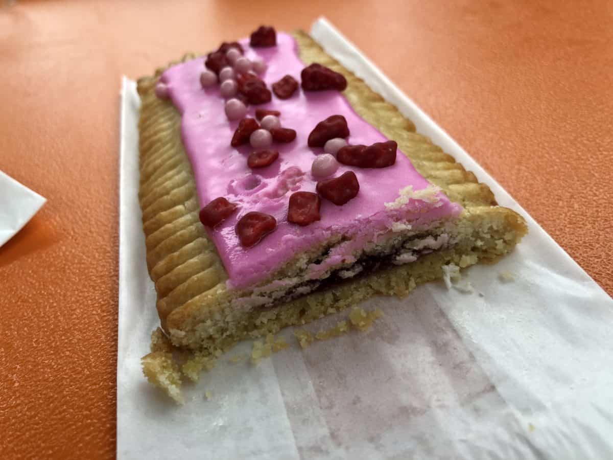 Raspberry Lunch Box Tart – Raspberry Marmalade stuffed Pastry coated in a Strawberry Fondant and Crispy Pearls -$3.29