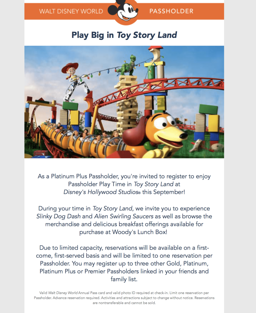 Passholder Play Time is now open for reservations on every Tuesday through Saturday in September. Passholders must receive an email invitation in order to sign up. Apparently not all passholders are receiving the email at the same time today, in what we assume is an effort to spread out the signups so as to not overload the servers. But we have the secret link for you! Just GO HERE to log in to your Disney passholder account. Once you log in, it should automatically forward you to the signup page, but if not, click THIS LINK after you have signed in.
