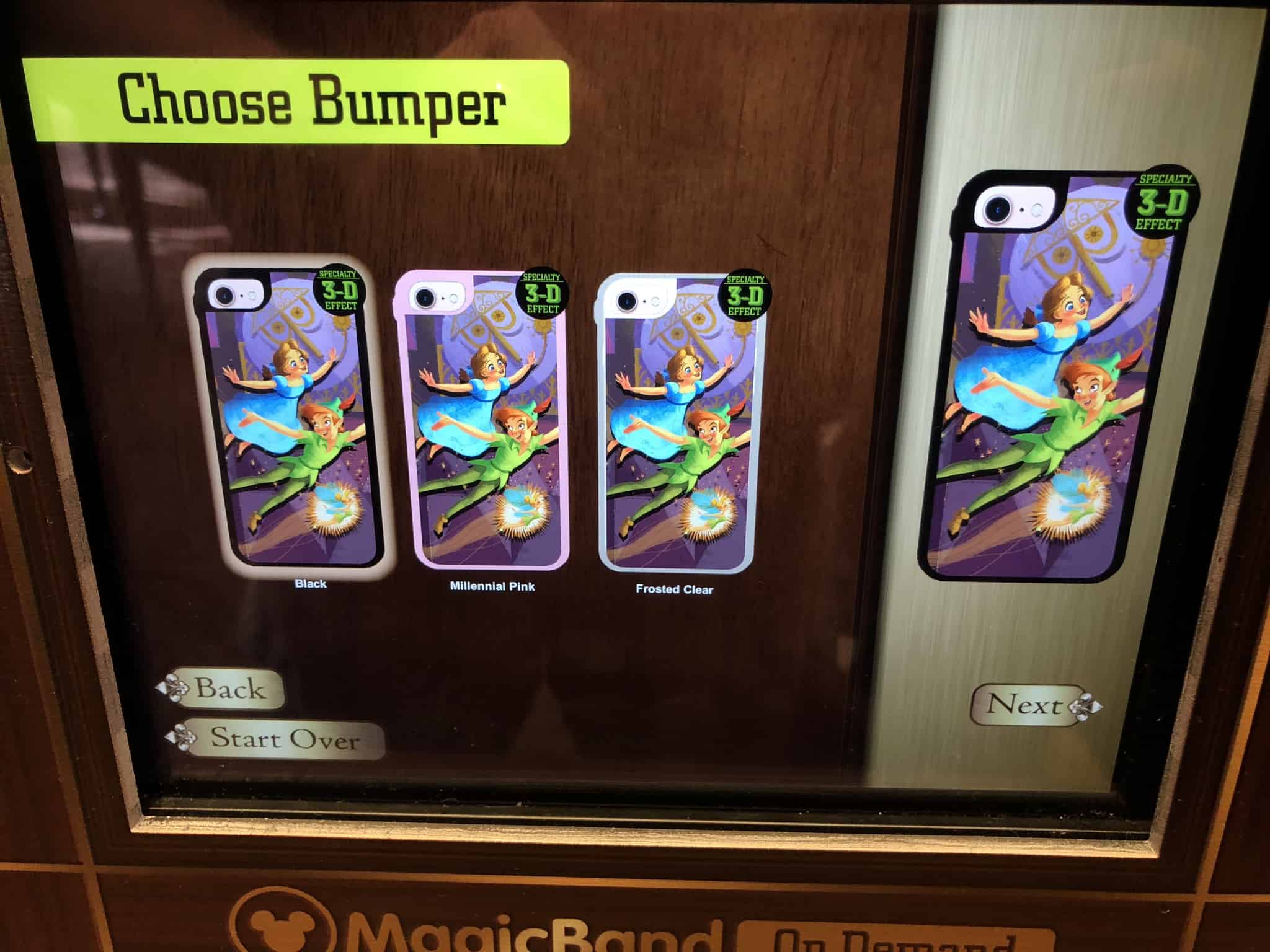 At various location in the Magic Kingdom, you will find D-Tech On Demand kiosks to help you customize phone cases and MagicBands for purchase. Brand new to the ever-changing lineup of choices are Frosted Clear and Millennial Pink options for phone cases. Customizable Millennial Pink MagicBands will also be offered starting soon.