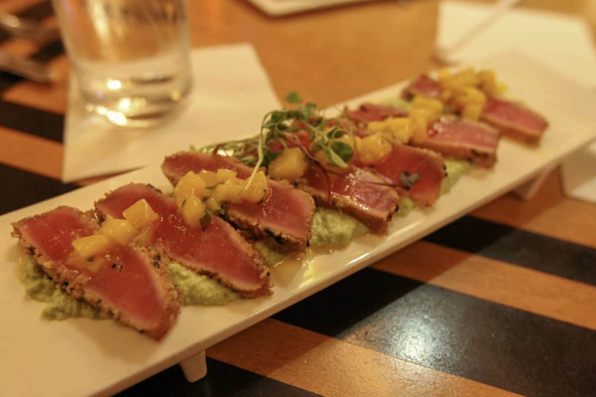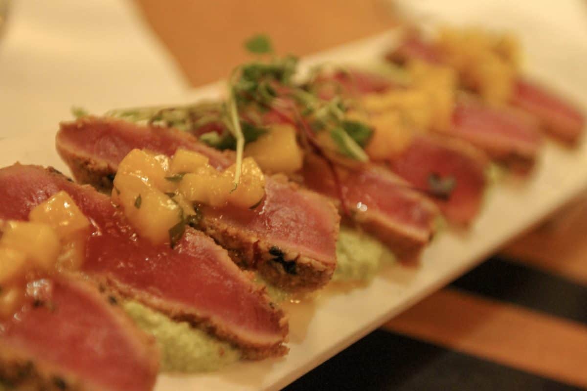 Spice-crusted Ahi Tuna – Edamame Hummus, Mango Salsa, and Chili Oil – $11.00