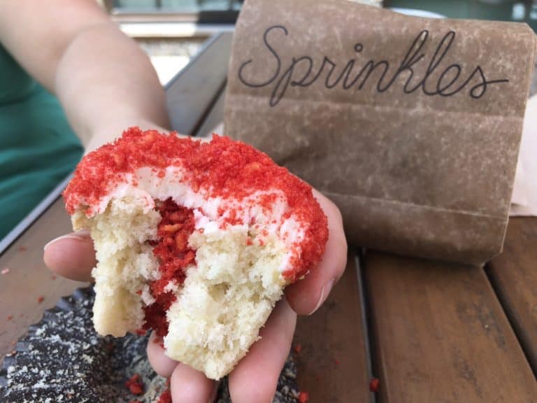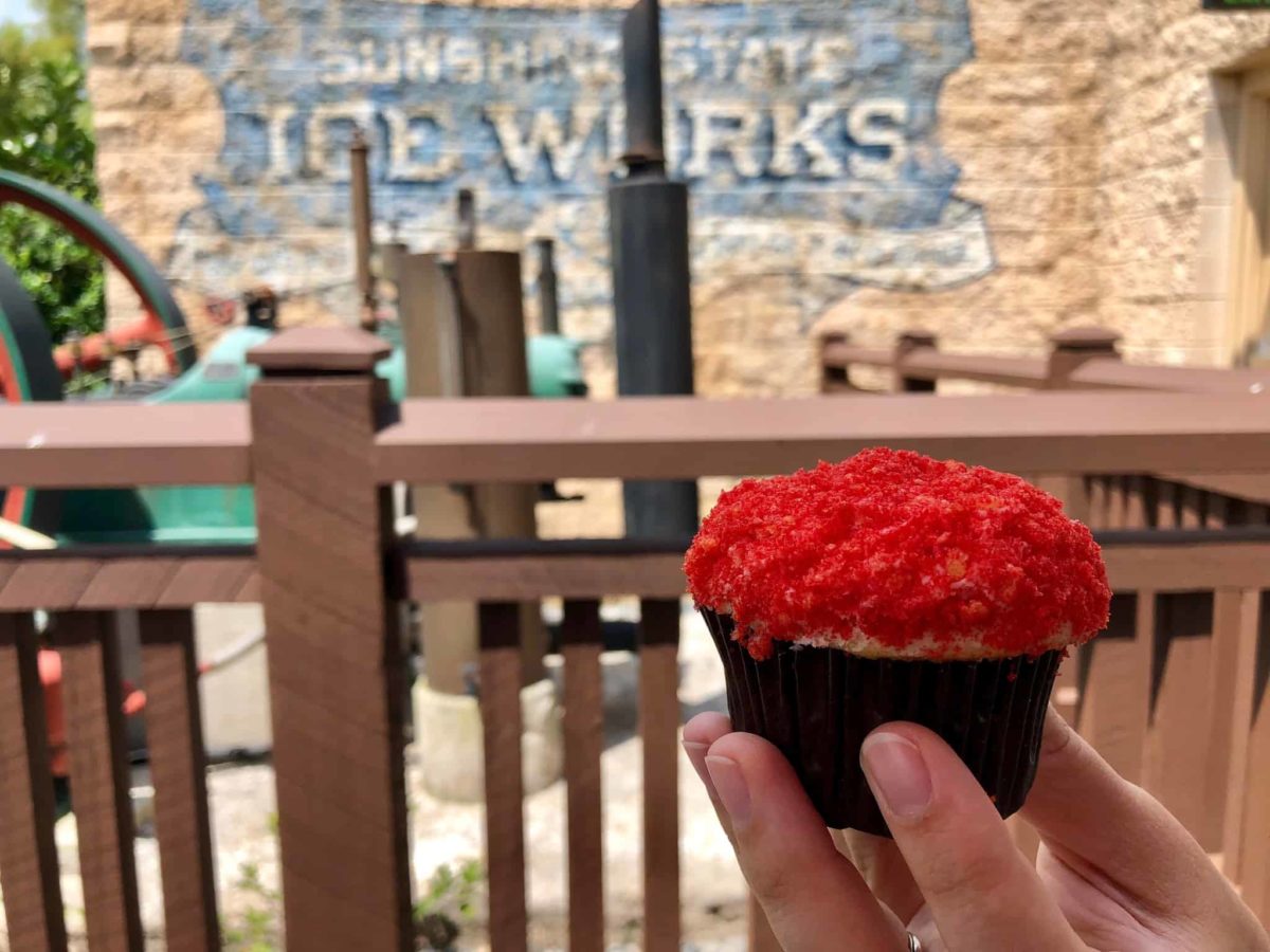 Sprinkles at Disney Springs is at it again with a new signature dessert – the Flaming Hot Cheetos cupcake. Made with vanilla cake, the more savory elements come in the form of a creamy white cheddar frosting with Cheeto dust on top and larger bits packed in the middle.