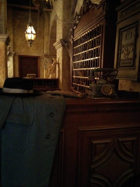 The hotel was abandoned the fateful night in 1939 that five guests disappeared and were never seen again, and the entire lobby reflects that. Dusty and untouched, it’s full of items that were left behind and haven’t been moved since. The front desk is no exception; layered in cobwebs and dust it sits empty and quiet, the undelivered mail in the cubbies behind the desk aged and forgotten, and the phone pale with dust and unused for decades. Then there’s my favorite touch. The man’s overcoat and hat, placed on the front desk perhaps by a patron checking in before they fled in fear for good, leaving them behind and never looking back. It’s touches like these that bring everything together!