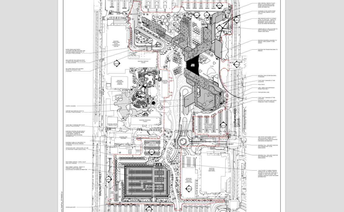 Documents filed with the City of Anaheim show more renderings of the new Disneyland Hotel as well as specifics about its layout. The hotel will encompass 31 acres which were reclaimed from the western end of Downtown Disney, as well as the Disneyland Hotel Valet and Simba parking lots.