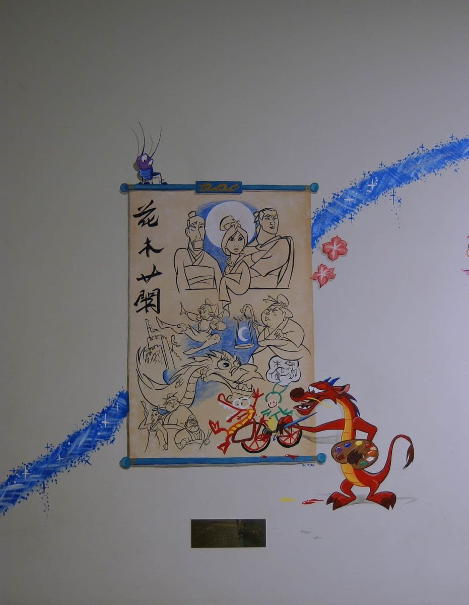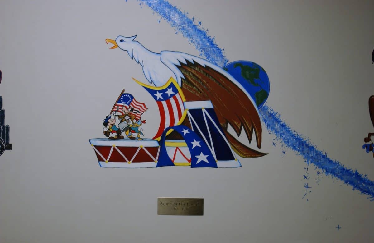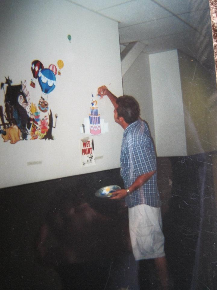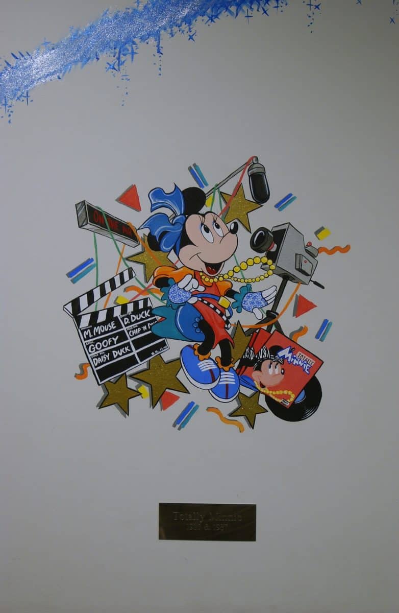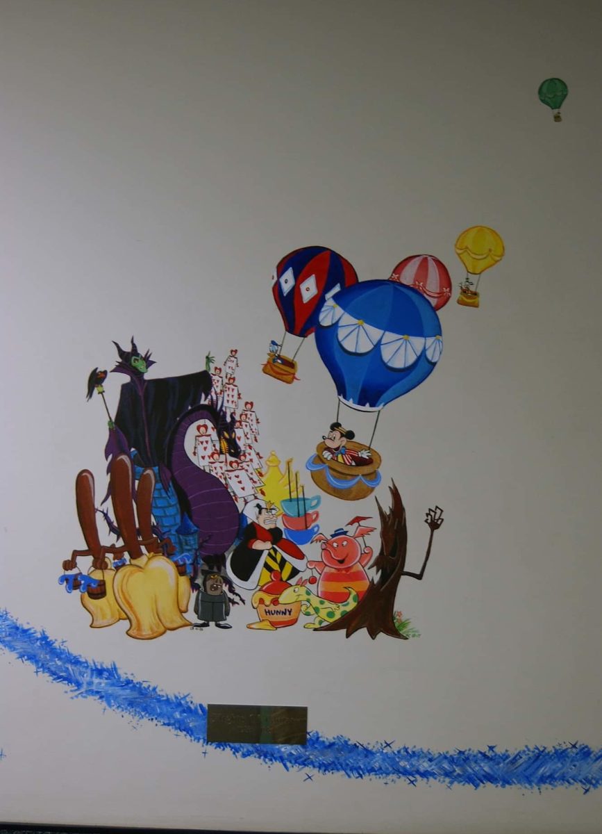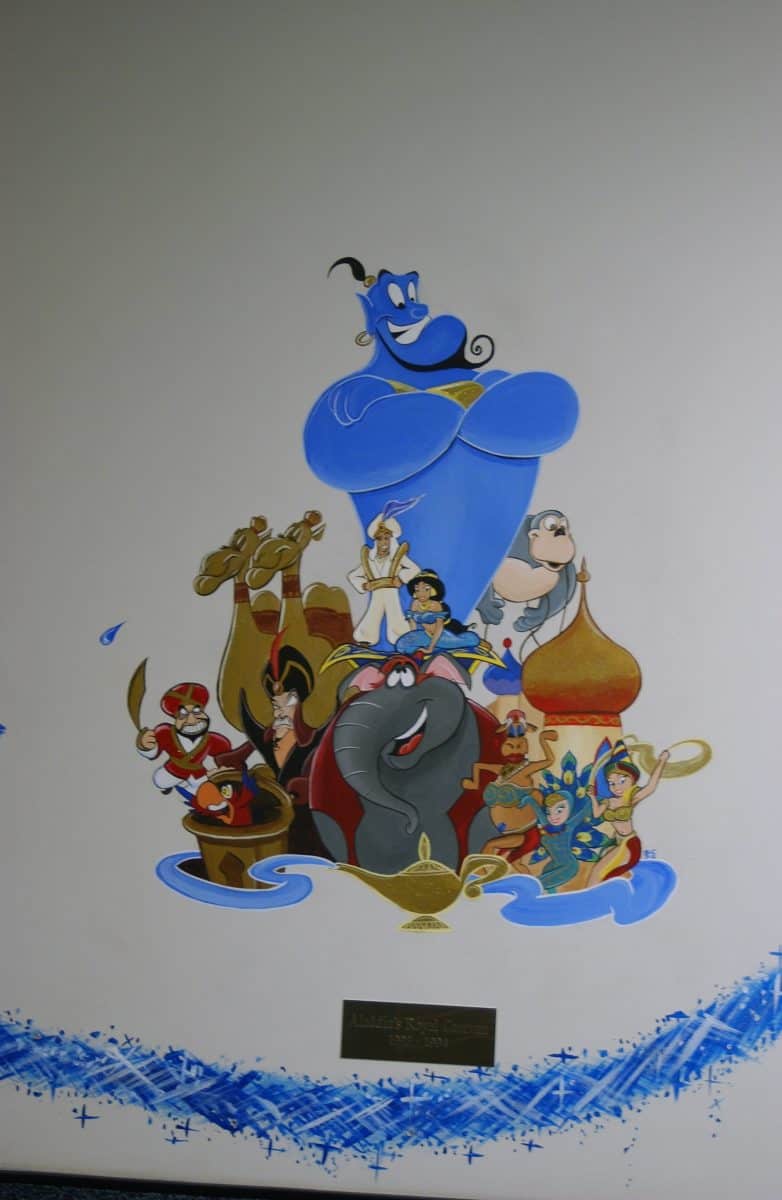 The shock of people seeing a kid painting on the walls was something everyone had to get used to. Most thought I didn’t get permission. Seriously? I had endless chats with Cast Members on their way to somewhere who were fascinated with what was going on. It took two years from start to finish. It was the biggest project I ever agreed to do, and once I started there was no going back. After I finished the first main chunk, I went to a trophy shop and had names and years engraved for each on the placards you see underneath. I gladly welcomed some assistance from my friend Erik, he was equally as passionate and a decent artist. I handed off the “Snow White Parade” that the park had for the film’s 50th Anniversary, I think it was his first Parade he performed in. He also wanted to paint some of the characters he performed as, sprinkled throughout the timeline. I was all for the help, that meant one less thing for me to do on this beast of a wall. I’d say the entire wall was about 100 feet, and lived mostly between the performer lockers and the wig/make-up room, so there were often mass crowds running back and forth behind me while I painted. I’m confident that I could paint in any war zone because of that kind of conditioning.