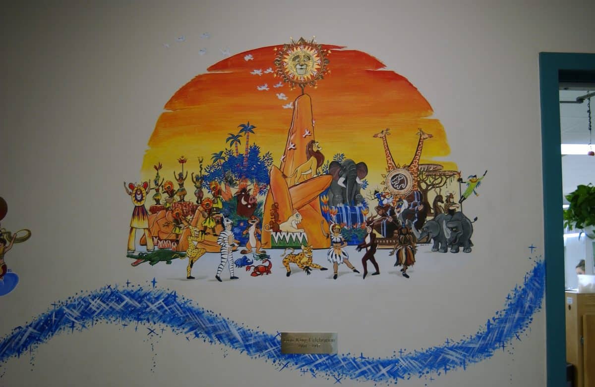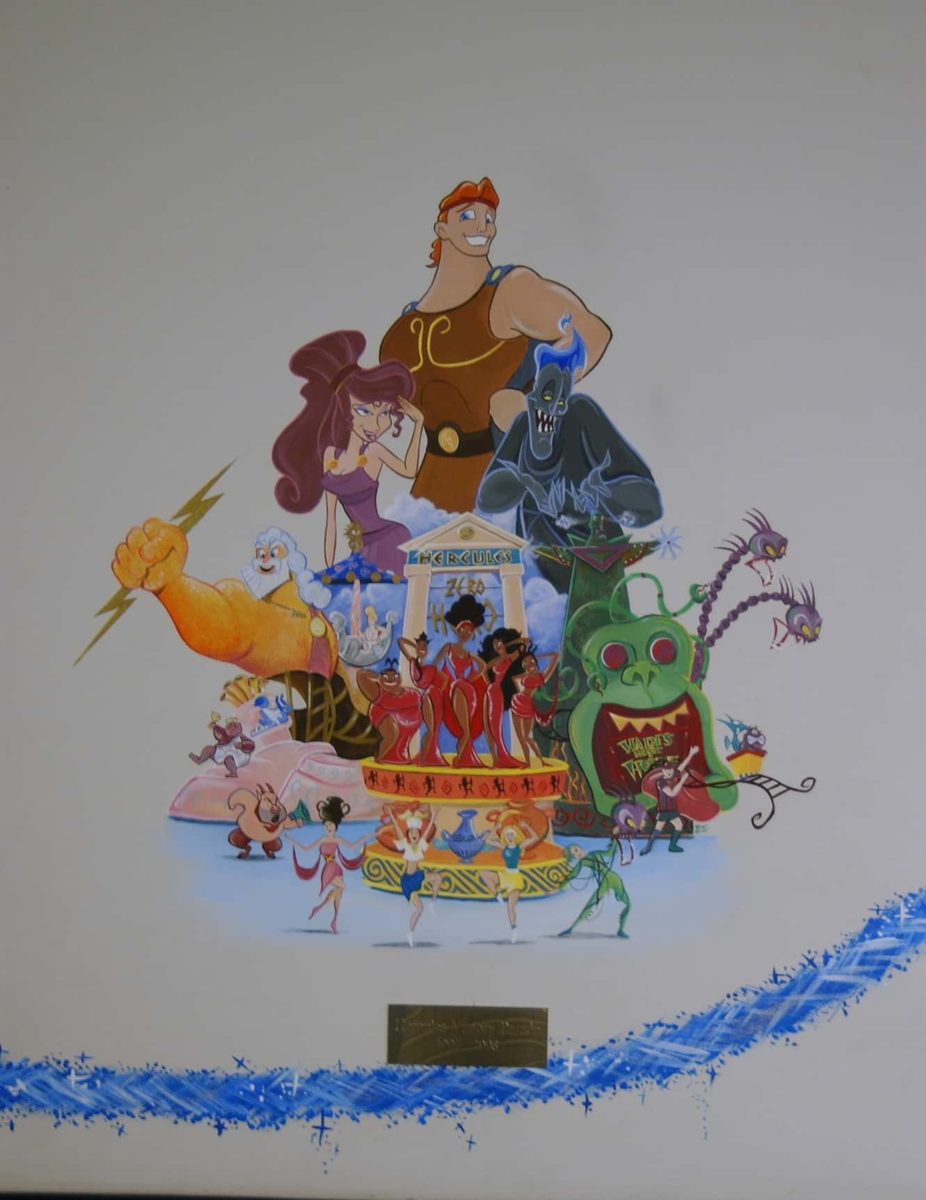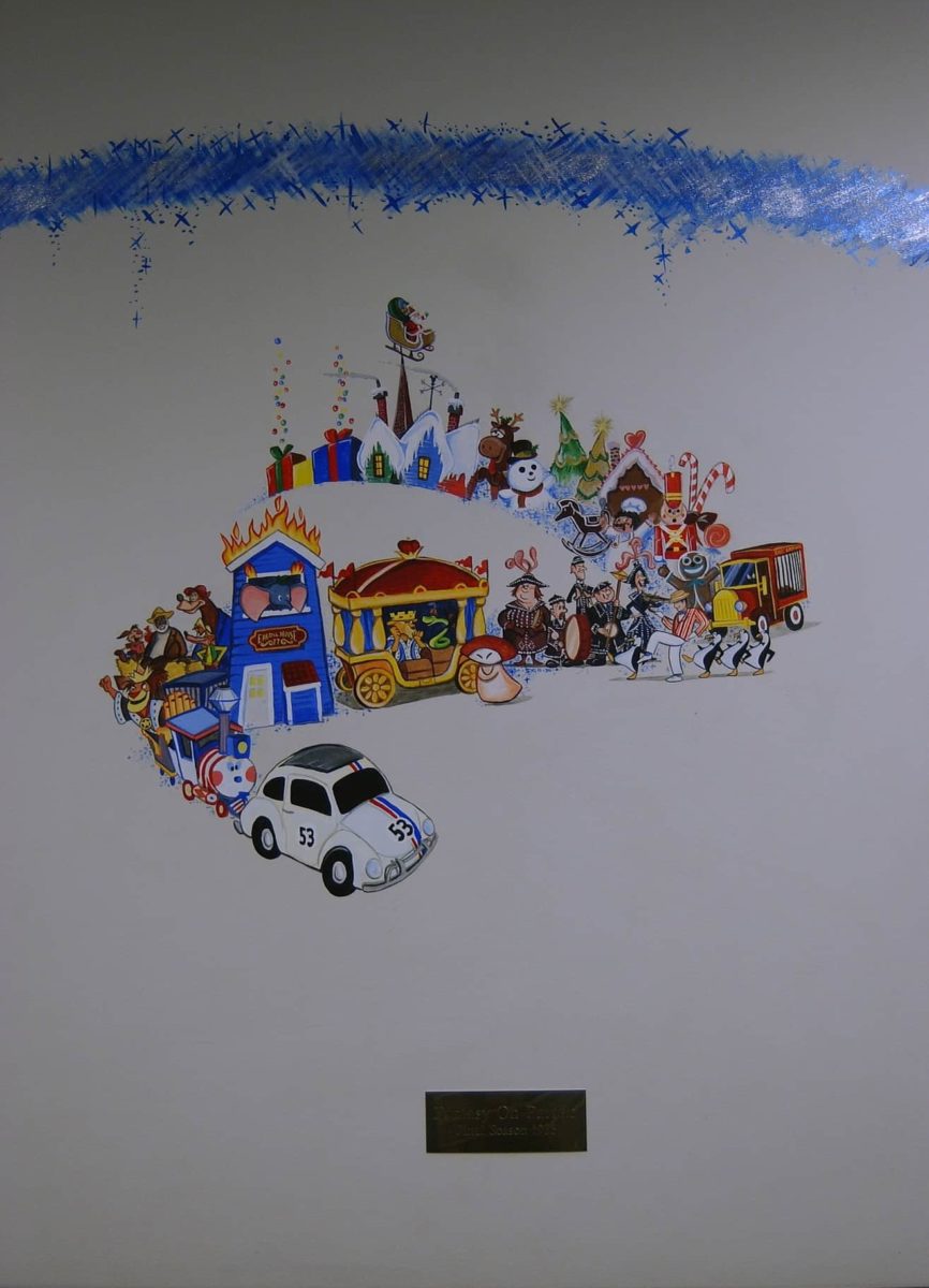 Fast forward about 5 years later, Parades got a brand new building backstage, “N-19”. It was right behind the flat faded green hills of ToonTown. It looked more like a doctors office than a place that made so much magic. I happened to mention to my manager that there should be some sort of art in the main hallway that depicted the history of the parades in the park. I thought it was important that the people working there knew the legacy of this department. Never thinking anything would really come of it, I got the green light. But sadly they couldn’t pay me for it, it would have to be done on my own time. I didn’t mind, I just wanted it to happen. Luckily with Parades, there was always a couple of hours in between shows with nothing to do.