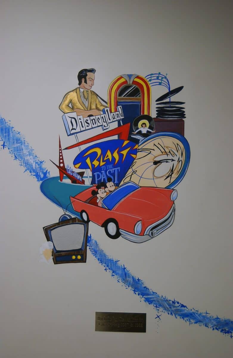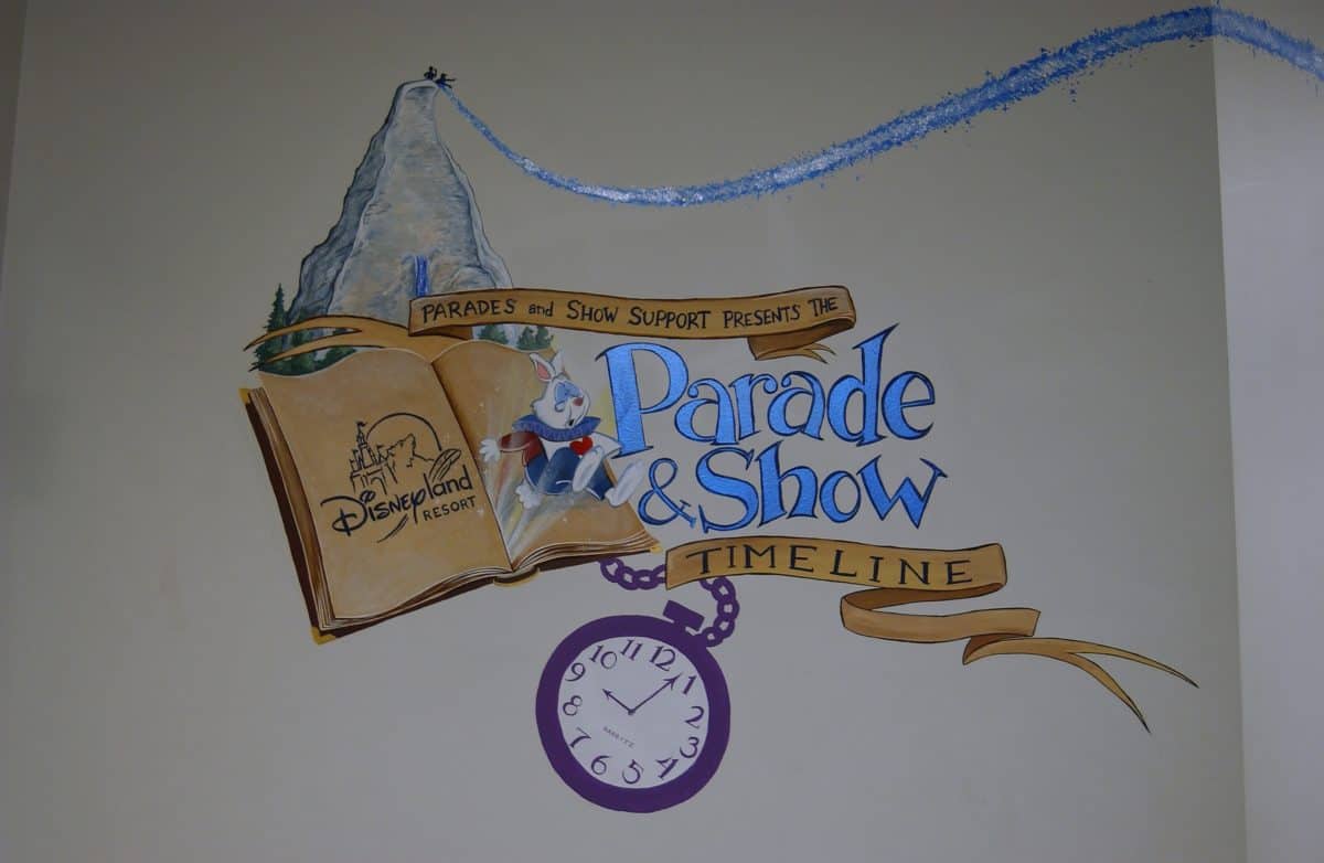 [Editor’s note: This is part one of a guest post by artist and former Disneyland Cast Member Sam Carter. The story and images below showcase a mural Sam painted on the walls of N-19, the backstage Parades building, between 2001-2003. WDWNT.com is pleased to bring you this unique look at the history of Disneyland’s parades and shows, from the park’s opening through the 50th anniversary, through a mural that most Disney fans have never been able to see. Part two of the article will look at the final piece of the mural, dedicated to Disneyland’s 50th Anniversary. Our deep thanks to Sam for this contribution. You can find Sam’s artwork online at SamCarterArt.com and following him on Twitter at @Cartarsauce ]