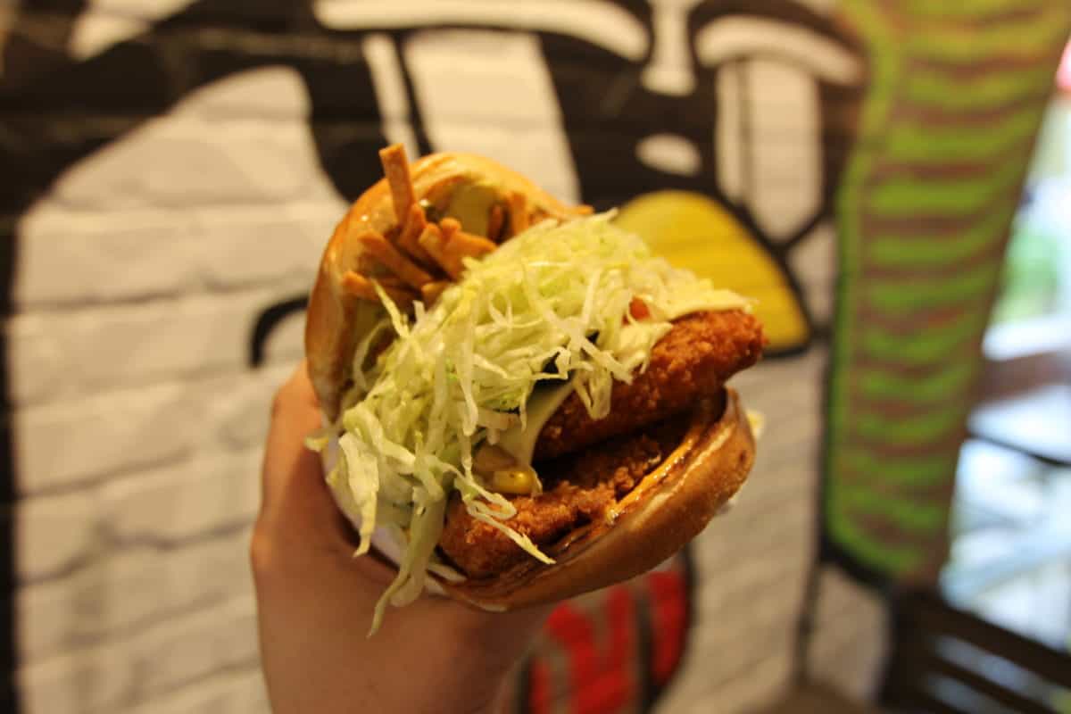 Let’s begin with a reoccurring problem: the excess of lettuce. We know this is a Guy Fieri staple but it really overpowers the sandwich. We said this about the knuckle sandwiches at Planet Hollywood as well. The chicken, bun, and sauce are good, but the problem is the abundance of lettuce. This makes us lean towards the chicken tenders instead of any sandwich, for the most part.