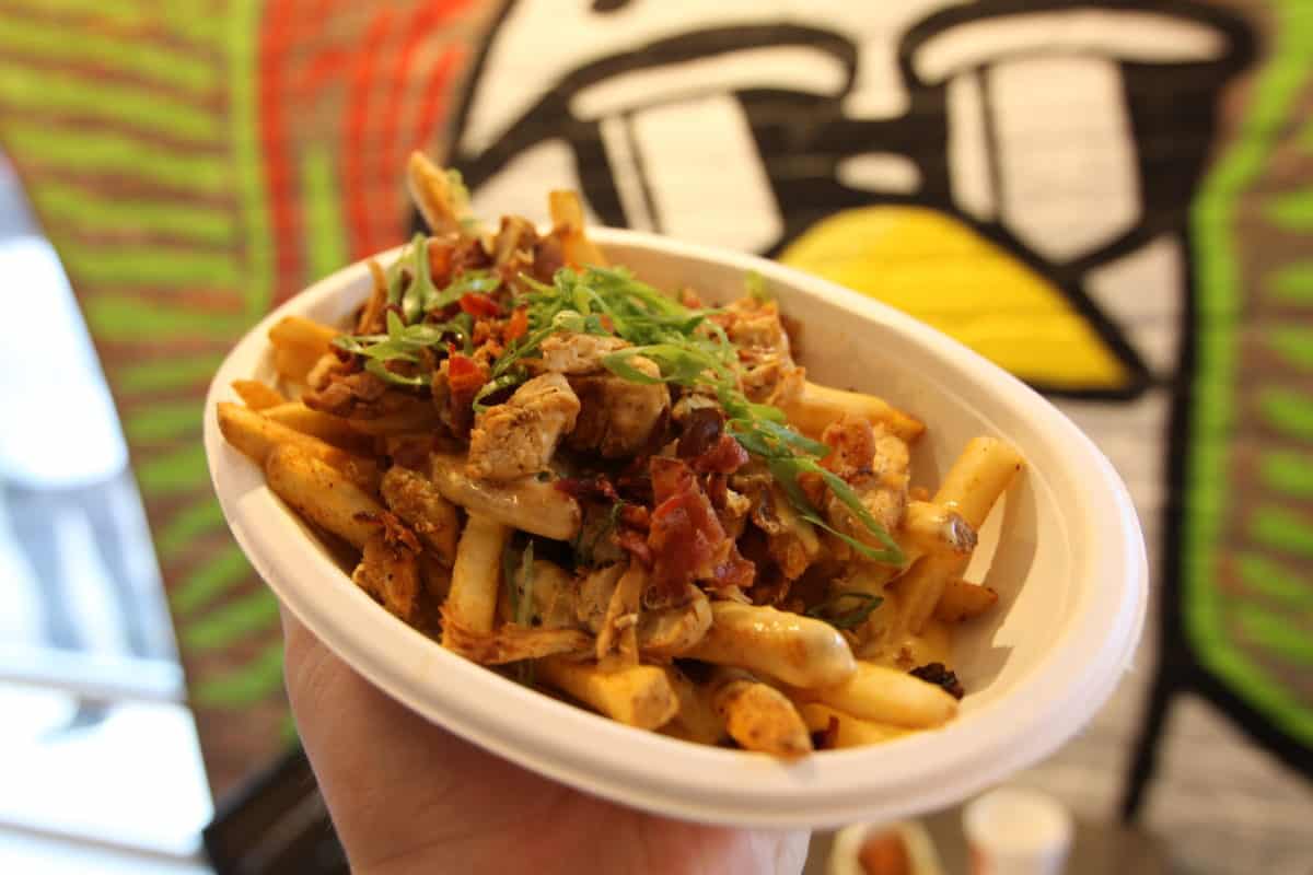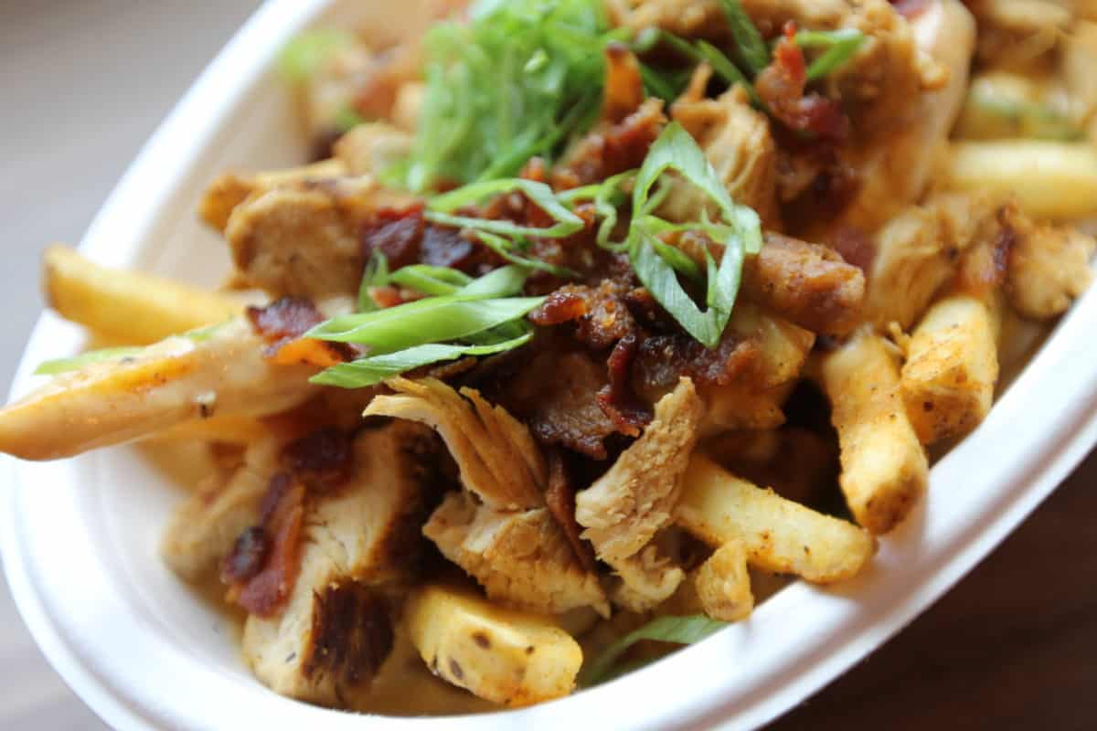 Loaded Fries ($7.99) – smothered in SMC (super melty cheese), chopped grilled chicken, bacon & green onions