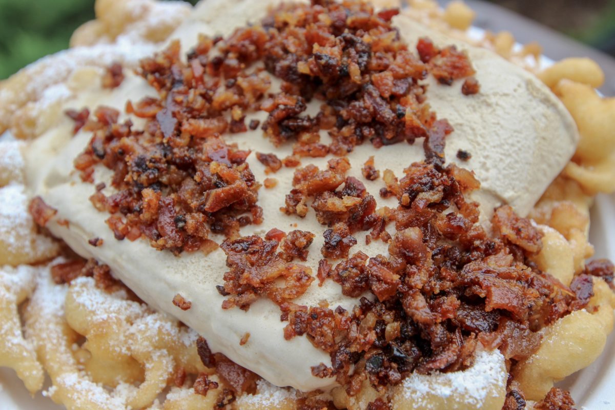 The funnel cake is made with the standard funnel cake batter – no special ingredients are added to the batter. It is then topped with the obligatory powdered sugar before the addition of maple ice cream and candied bacon.